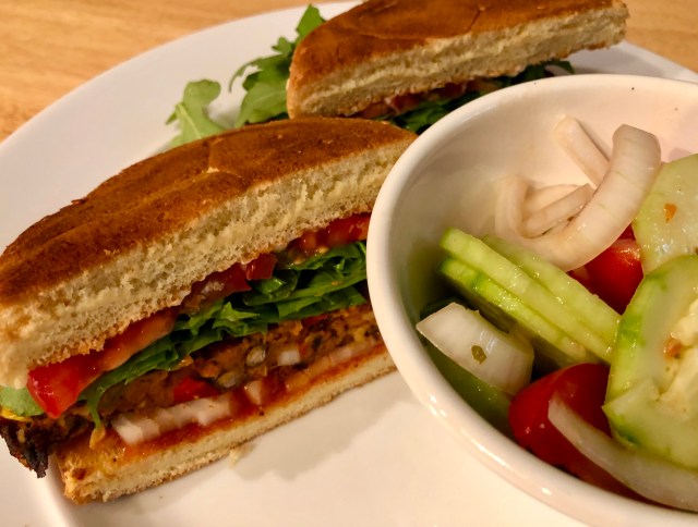 You can make these burgers in two minutes in the microwave. For additional flavor John seared ours in a hot, cast iron skillet so it had a bit of a crust on it. I garnished mine with onion, tomato, arugula, and ketchup. On the side I made a cucumber, onion, and tomato salad. This chipotle bean burger is a simple, fast, meatless substitution that can easily stand in for a typical hamburger.
