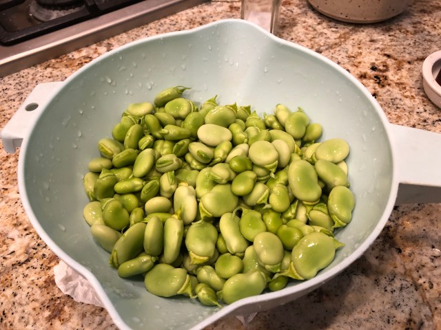 Before discussing our dinner, here is an update on our daughter’s plot in the community garden. With the exception of a few tiny strawberries this is the first harvest, fava beans! She and I shucked a bagful out of their large cottony pods which is the first step with fava beans.