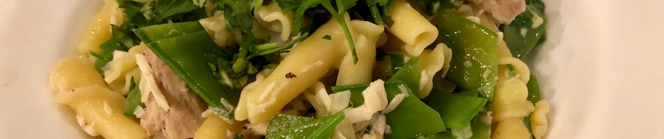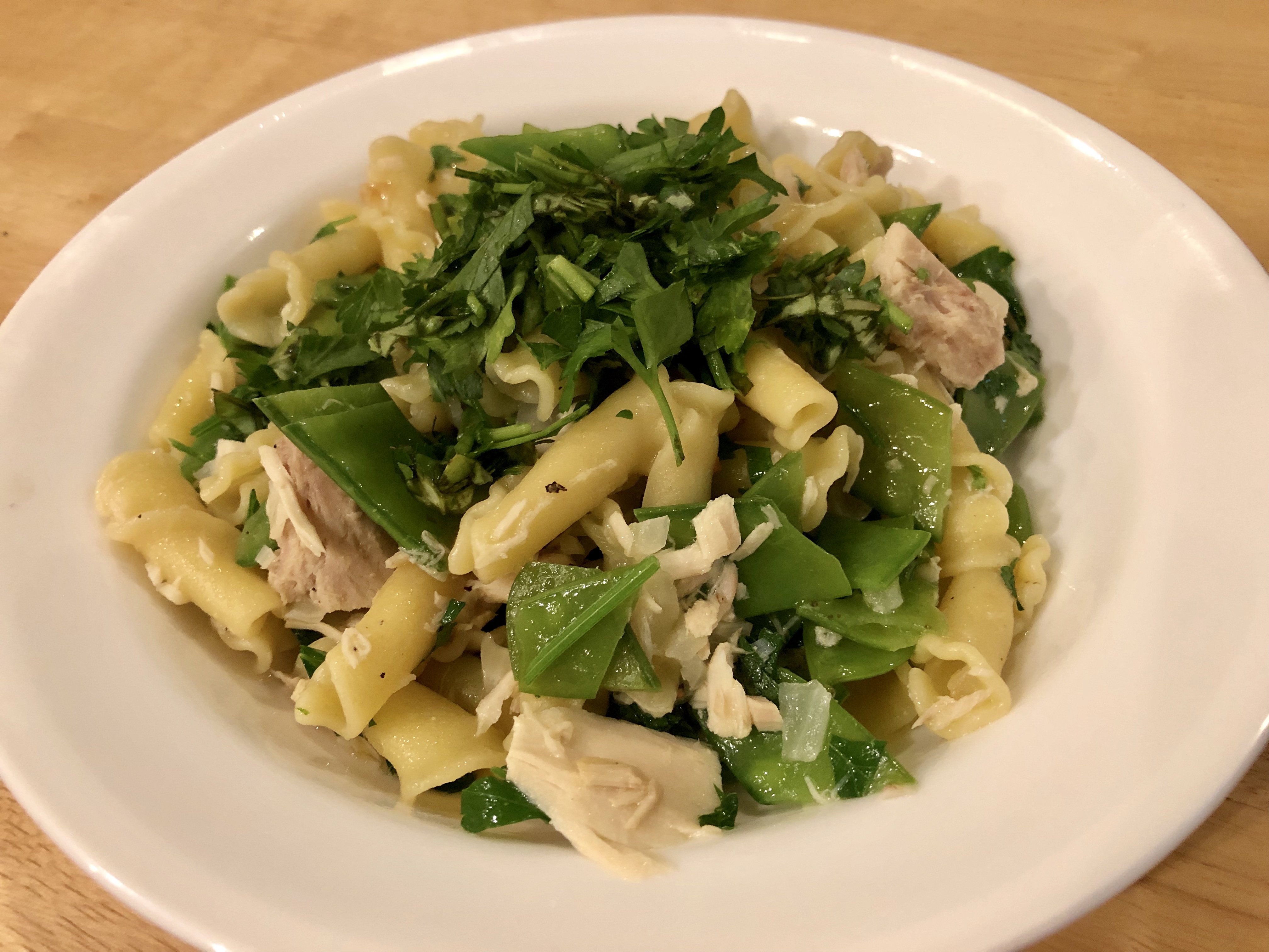 Today, for my half birthday celebration (what? you don’t celebrate your half birthdays?!) I made campanelle with a lot of snow peas and parsley plus a can of tuna. I sautéed a little onion and garlic and then, when the pasta was ready, I added it along with the tuna, parsley, and snow peas to the onions and garlic. The heat of the pasta warmed up the veg and tuna. The sauce was basically just some pasta water and EVOO. It probably could have benefited from a little acid like some lemon juice or a handful of cherry tomatoes. I will have to remember that for next time.