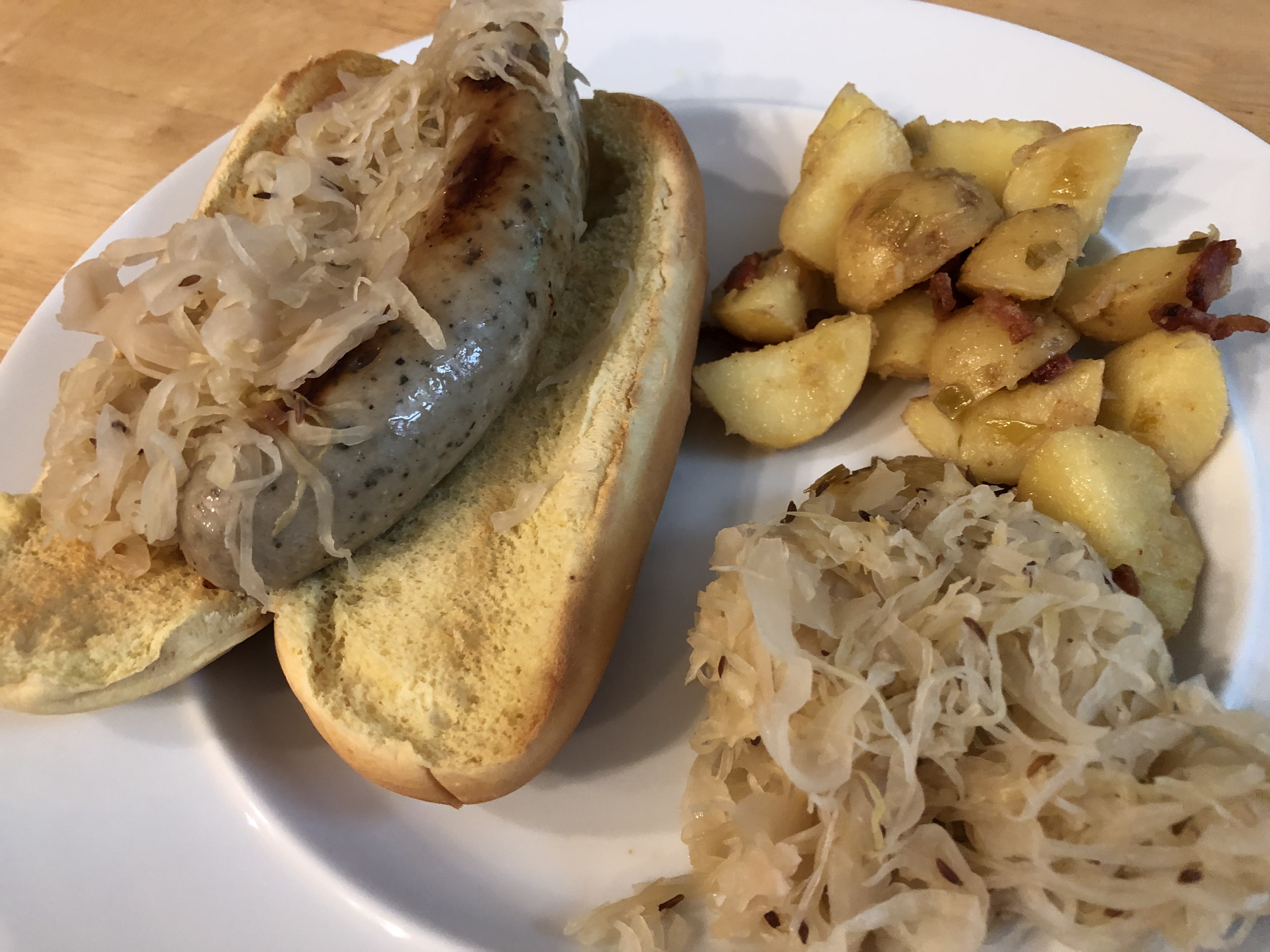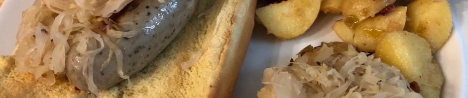 I listened to a clip from America’s Test Kitchen about sauerkraut and which brand is best to buy.  Amazingly they said the tasters liked the canned or jarred sauerkraut that is on the grocery shelf, not the stuff in the refrigerator case. The refrigerator stuff has preservatives in it to keep it from turning dark. Libby’s brand was the favorite. Always look for sauerkraut whose ingredients are cabbage, water, and salt. That’s it. We added about 1/2 teaspoon of sugar and some caraway seeds in ours.