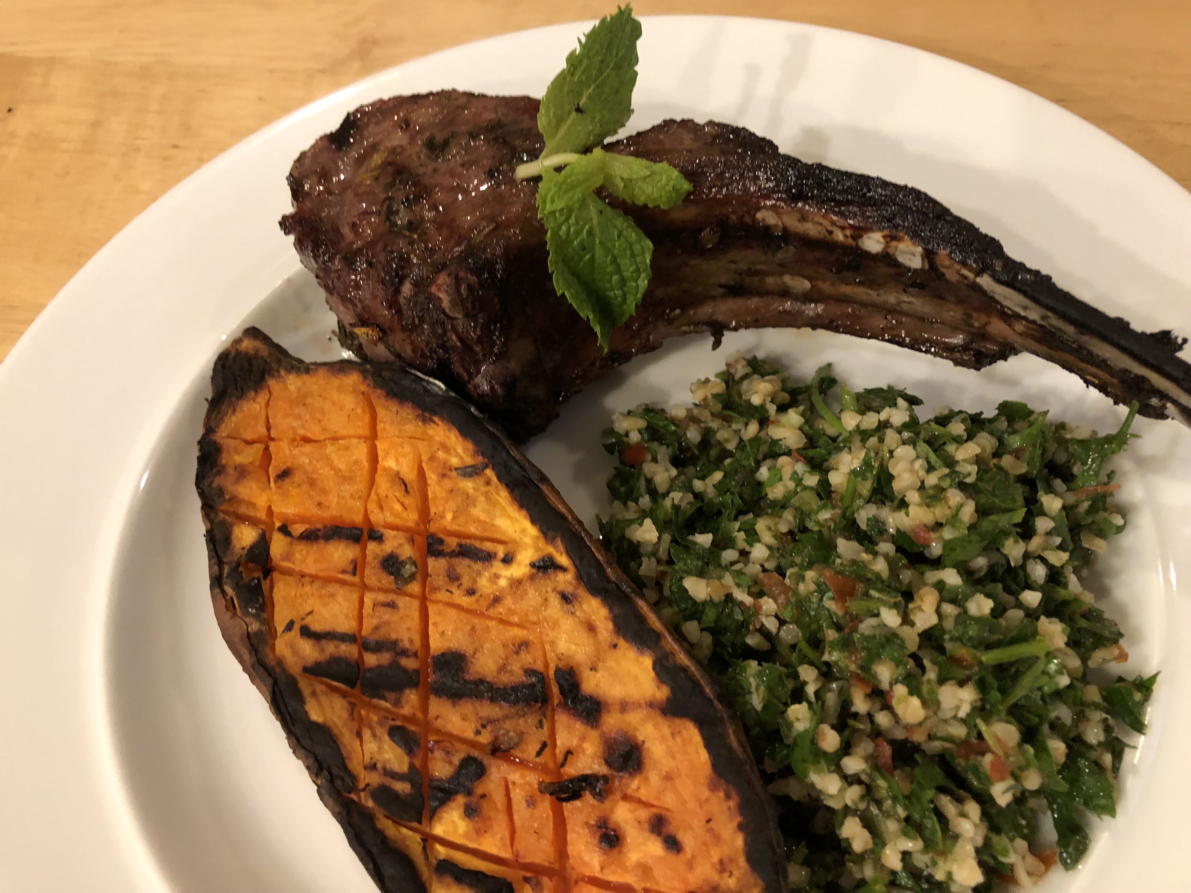 The grilling refers to the lamb chops which were sous vide and then grilled outside and the sweet potato which was microwaved and then also grilled. Except for the hot water from the immersion circulator (132.5F) everything stayed pretty cool. For the chilling portion of dinner instead of making a cooked vegetable I opted for a very lemony, minty tabbouleh which paired nicely with the lamb.