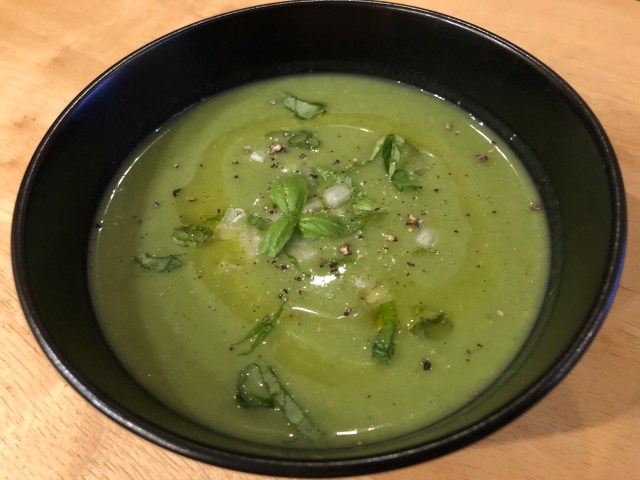 On Tuesday we had such a tasty summer vegan meal. I had some vegetables left over from clam chowder on toast night and the lamb chop and tabbouleh dinner and turned the potato, leek, and parsley into a green vichyssoise (that’s cold potato and leek soup with parsley.) I cooked the three ingredients in some olive oil and vegetable stock and liquified the results in the blender. After some chill time in the refrigerator it was ready for dinner garnished with our “good” olive oil and some basil.