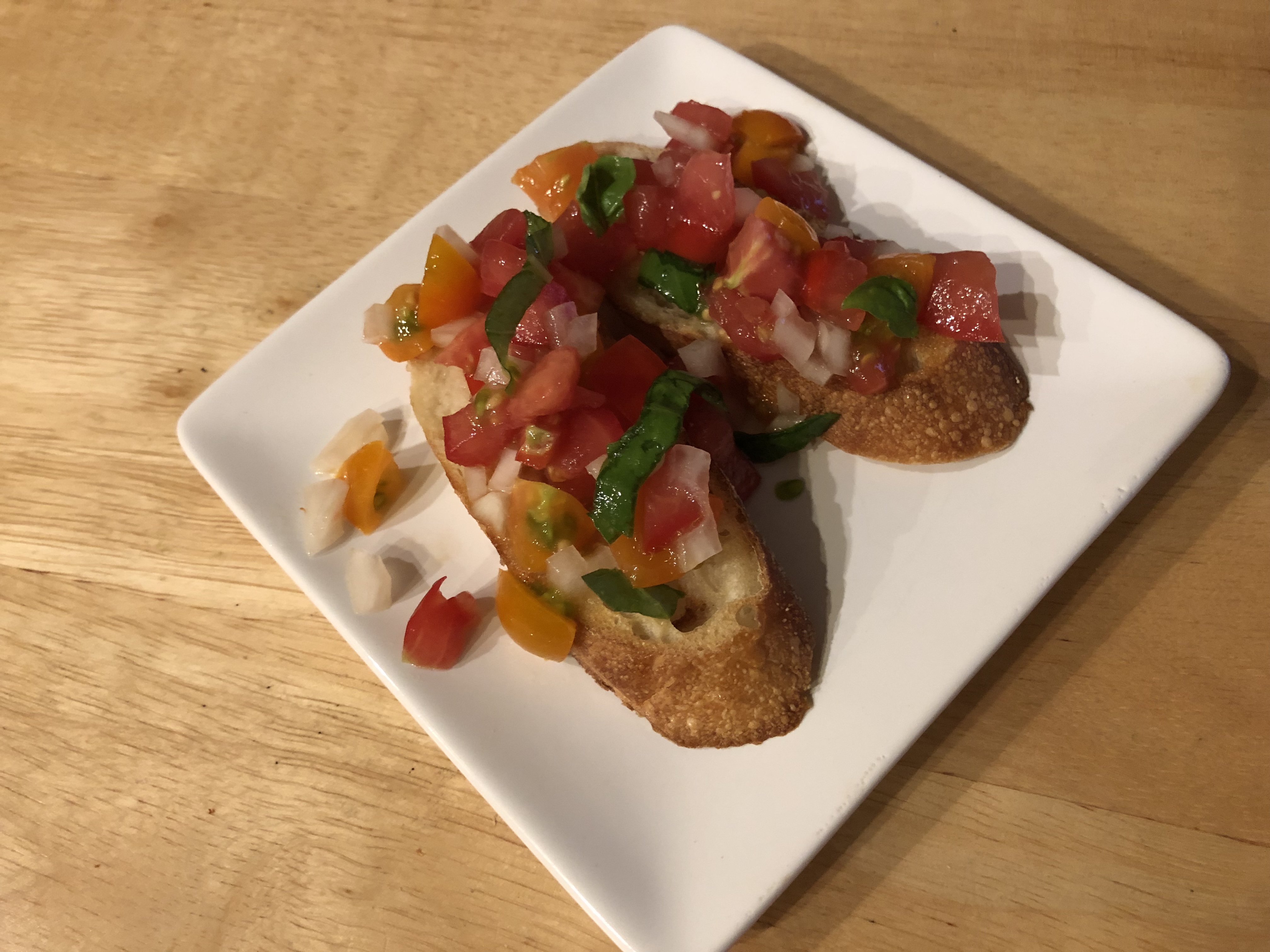 With our soup we had crostini fresh from the garden. I topped our toasts with my first tomato from my Early Girl tomato plant and some of my daughter’s golden cherry tomatoes from her plot at the Community Garden. In addition the basil was from the pot I have sitting on our patio. The onions were from the grocery store along with the garlic that I rubbed on the toast. A drizzle of olive oil, some salt and it was perfect.