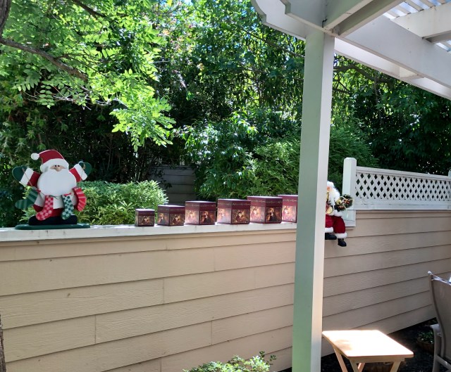 In keeping with the theme I put our Christmas wreath on the door and decorated the back patio a bit and of course had a tree representation with presents nearby.