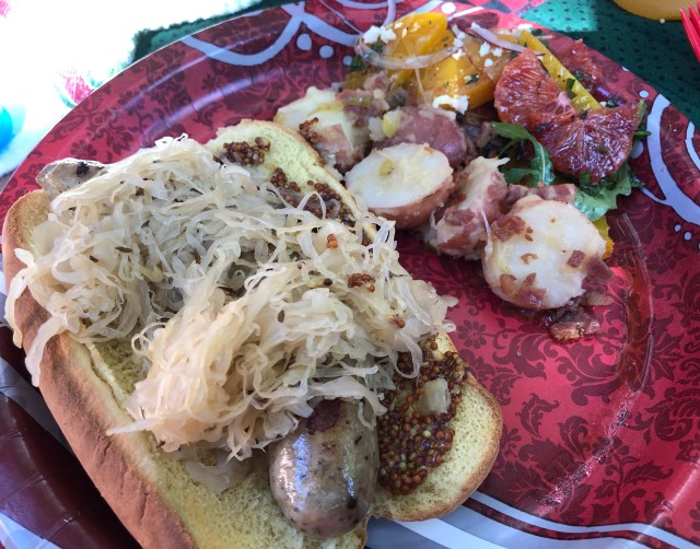Once the present opening was done we started in on the Christmas cookout food – hamburgers, bratwurst, a big summer fruit salad, potato salad, and roasted golden beets and blood orange slices with arugula and feta cheese. Later we had some ice cream with our daughter’s intensely strawberry sauce made from wild strawberries in her garden.