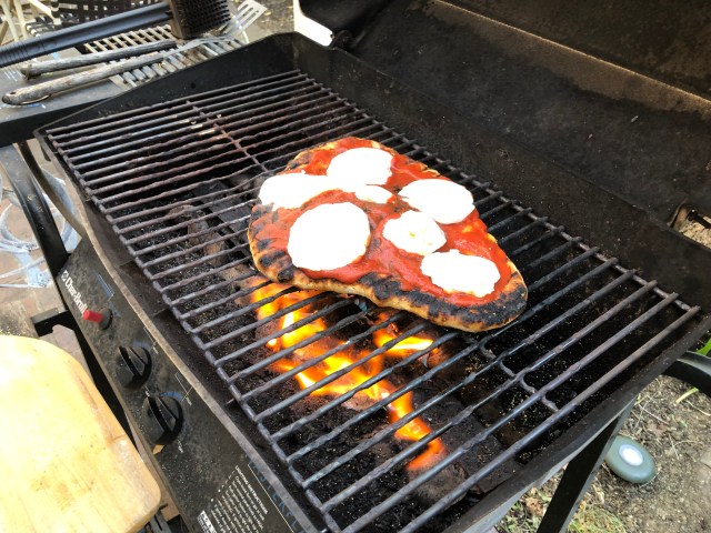 When the first side was done we hustled it back in the house. On the cooked side we spread some pizza sauce (can of tomato sauce, 1/2 can tomato paste, a few shakes of oregano and paprika, a pinch of sugar, and a table spoon of EVOO) and some slices of mozzarella. Admittedly I cut the cheese too thick. Then back on the grill with the sauced side up.