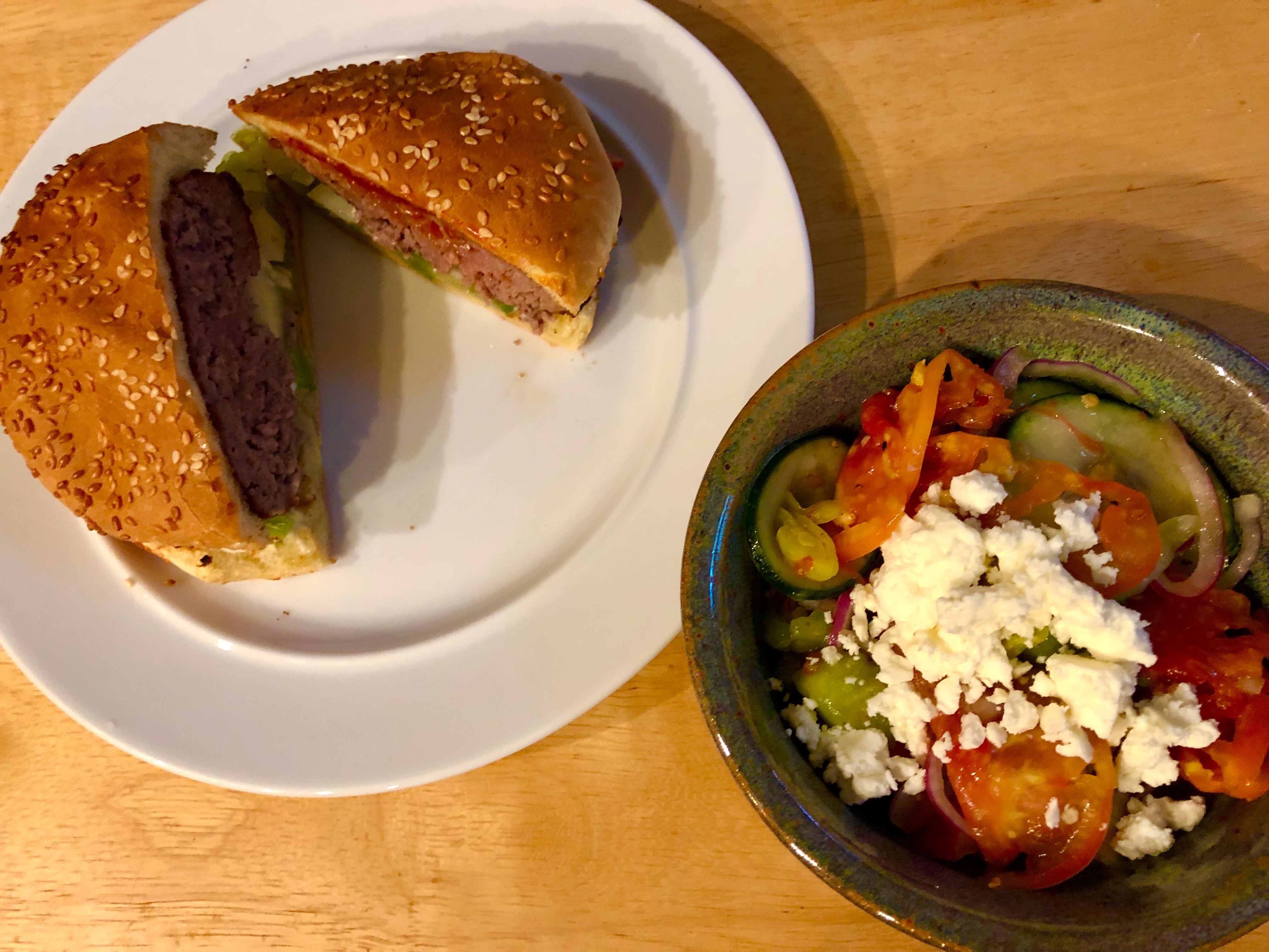 I was watching Guy’s Grocery Games the other night (it is embarrassing to admit that I watch this program but I do) and he was having a burger battle. He said that America’s favorite food is a burger and probably more precisely a beef burger. It made me stop and think about what my favorite food is. Certainly a hamburger is up near the top, also pizza, and almost any kind of pasta, the kids might say tacos, and truly I could probably finish off a loaf of freshly baked bread. But okay, I am willing to go along with the burger and I was pretty excited about having one since, as I look through my blog, we have not grilled a beef burger since May 6th!