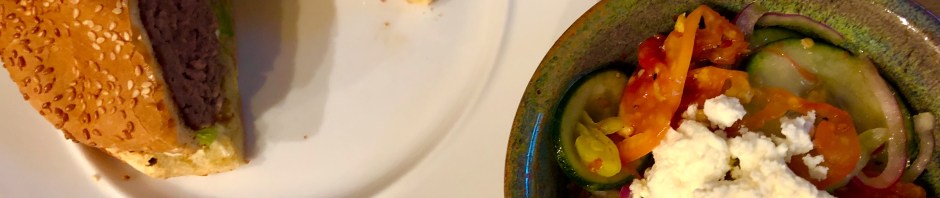 John makes an excellent juicy burger on the grill and I make an excellent tomato, cucumber, and red onion salad. I am using our daughter’s fabulous home-grown tomatoes for the salad.