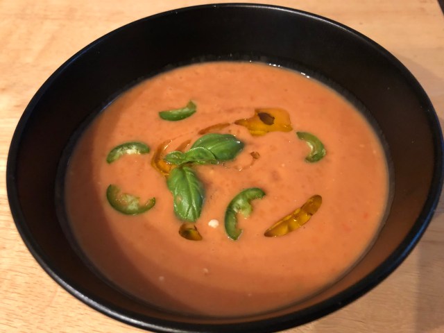 We top ours with our good olive oil, some basil from the garden, and bits of Serrano pepper. We were supposed to be eating avocado toast but instead we ate two bowls of gazpacho and called it quits.