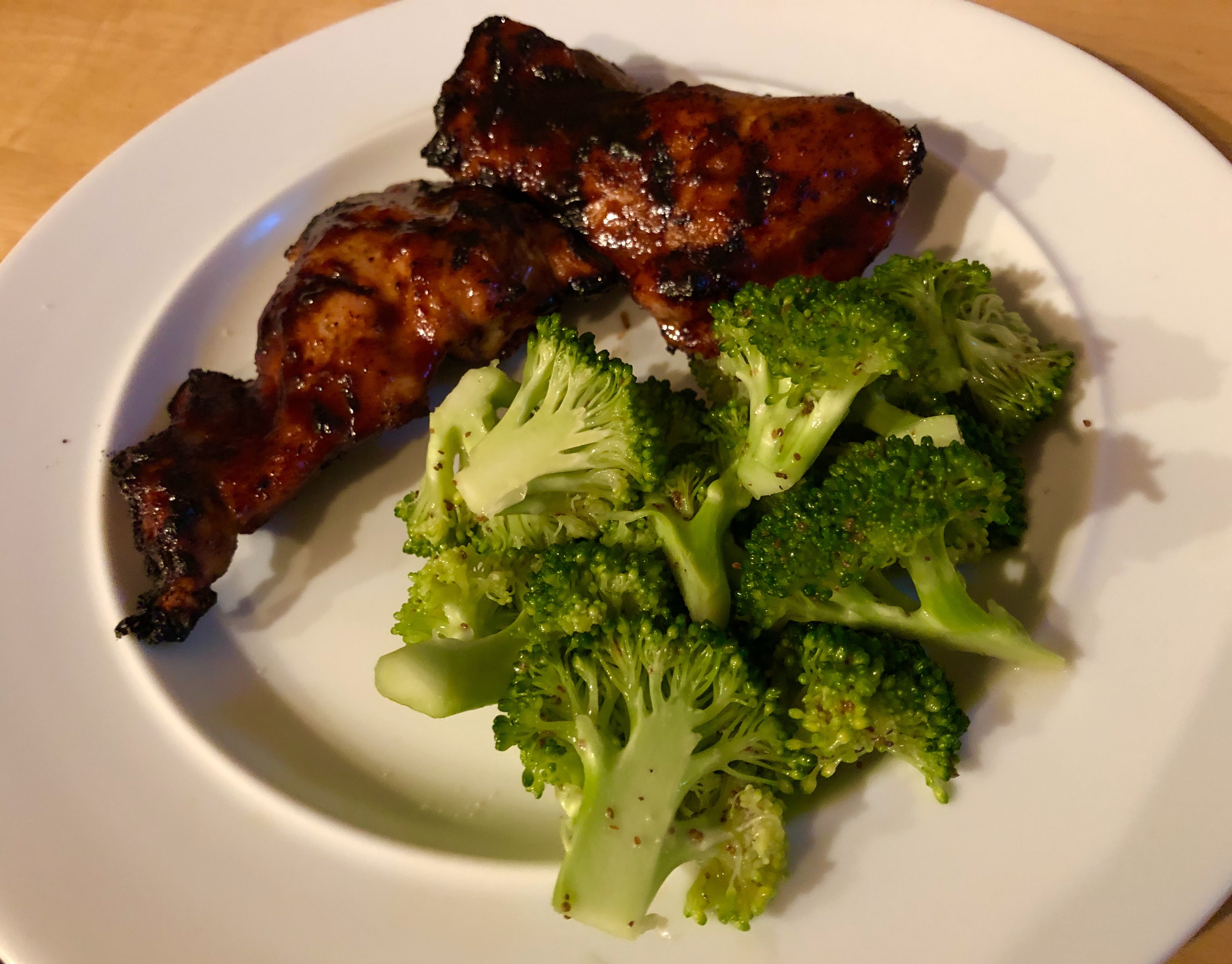 Following our salad first course we ate grilled chicken thighs with broccoli salad. We have decided that we like chicken thighs much better than chicken breasts. They are juicier and have more flavor. We get boneless skinless ones and John trims the fat. I am willing to spend a few more calories for more flavor!