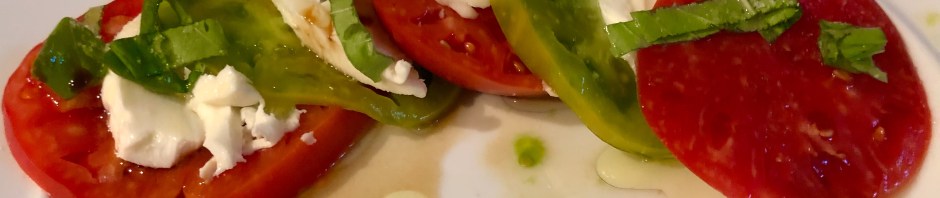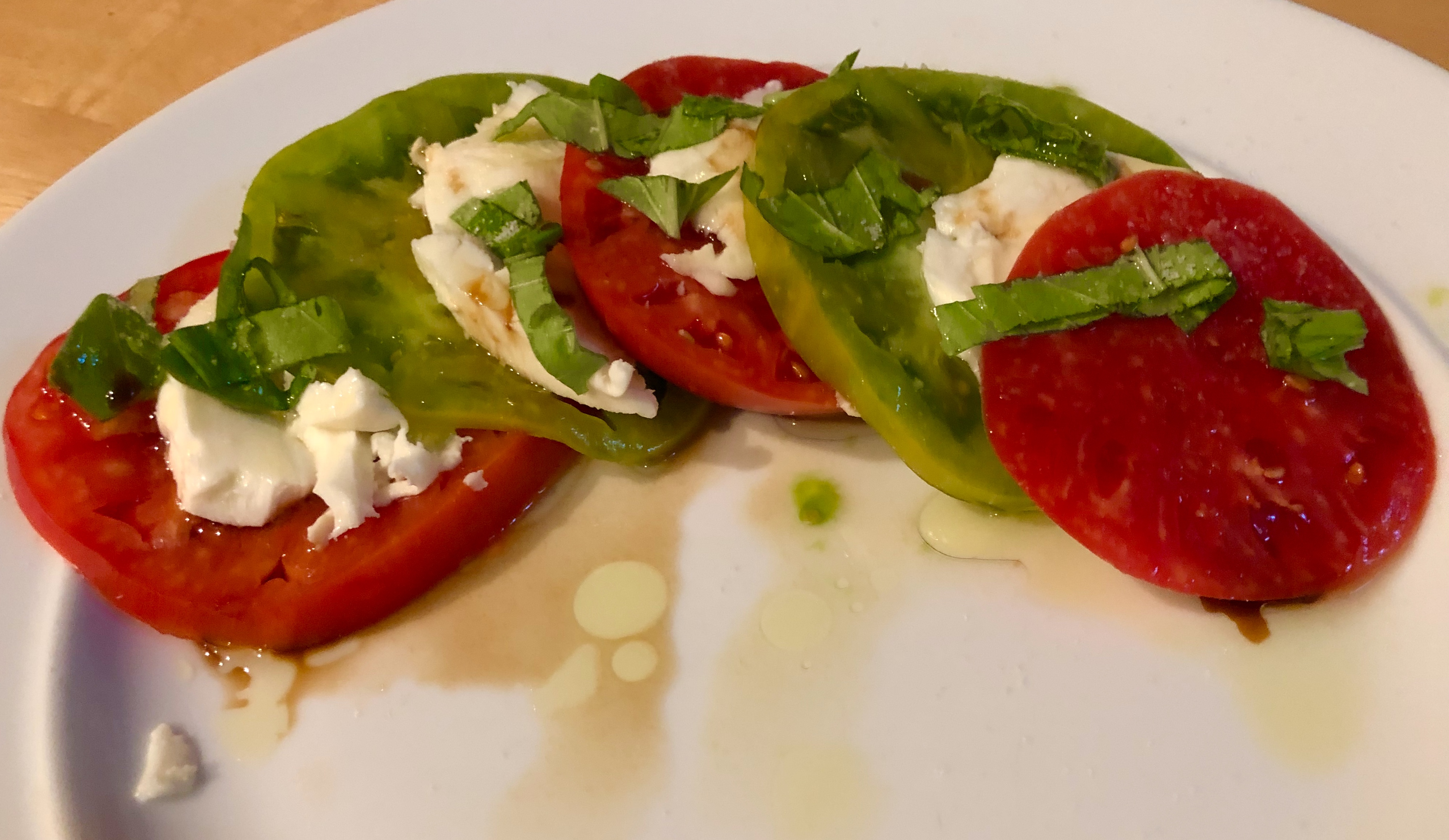 On Tuesday we used our bountiful tomatoes for Caprese salad. The salad is simply slices of tomato and mozzarella, a sprinkling of basil, and olive oil and balsamic vinegar. Oh, and don’t forget the salt! My salad looks like the Italian flag due to a variety of tomato that is green when ripe.
