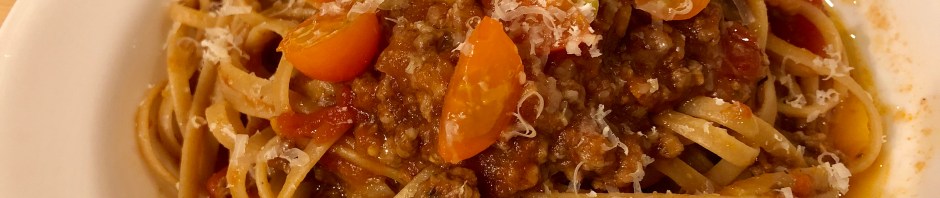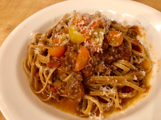 Wow, what an intensely bright and tomato-y sauce resulted! John made 8 ounces of whole grain linguine which gave us plenty of pasta for tonight and leftovers for lunch tomorrow!