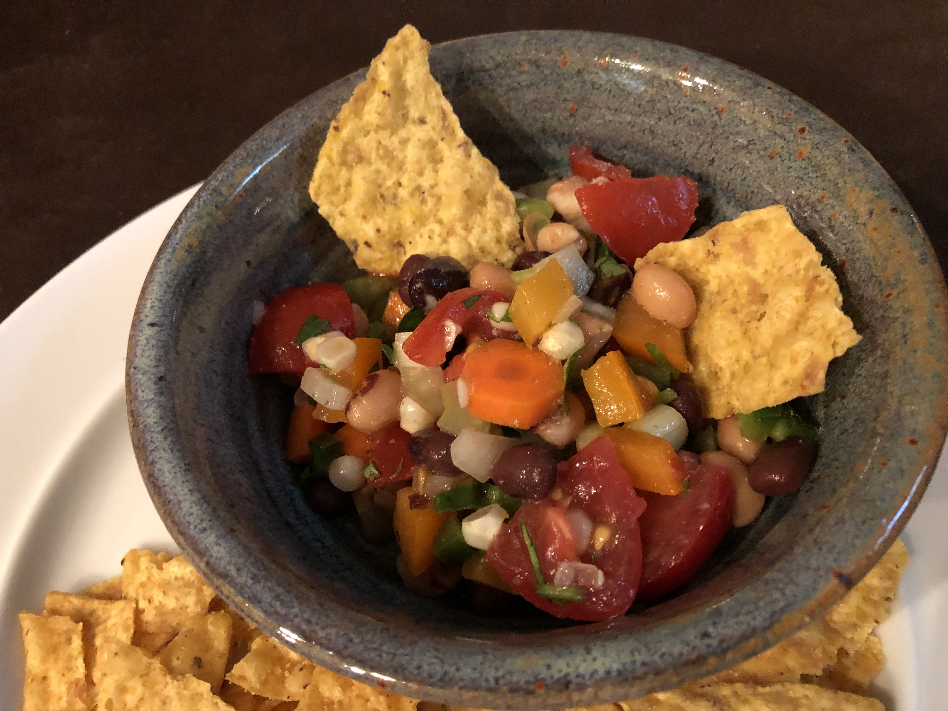 We had Texas caviar in two ways tonight. First as an appetizer before dinner with tortilla chips and then as the vegetable with our dinner. Since it was hot we just bought a rotisserie chicken from the grocery store and ate it cold with the salad.