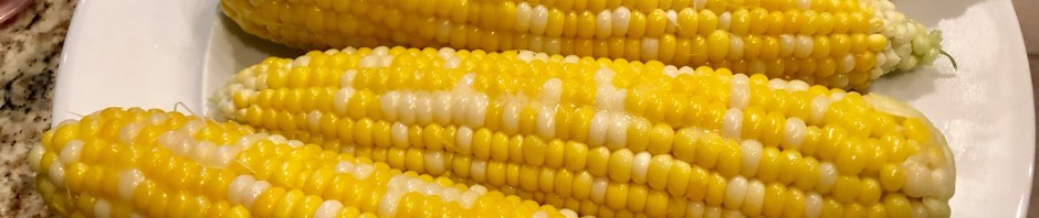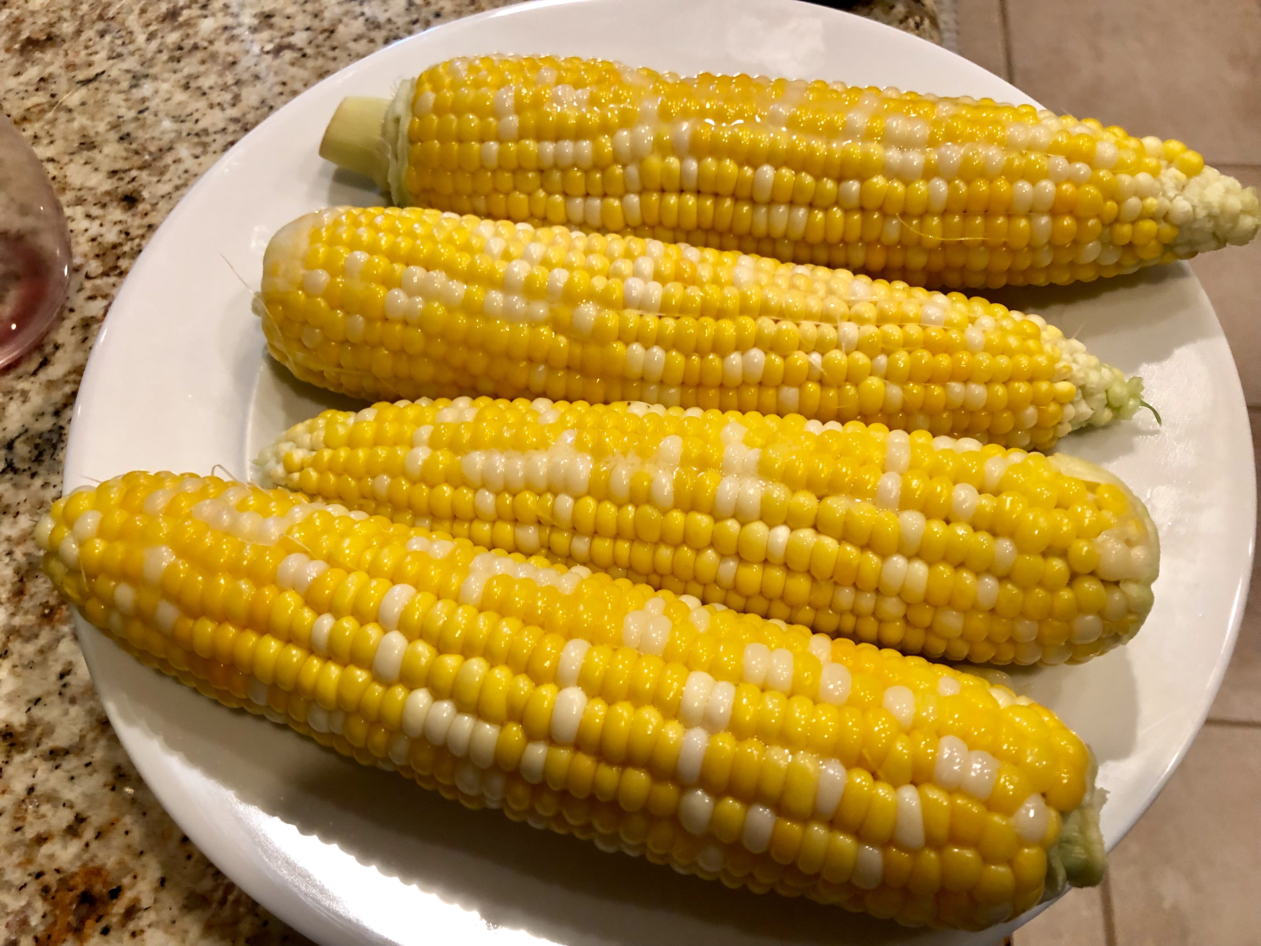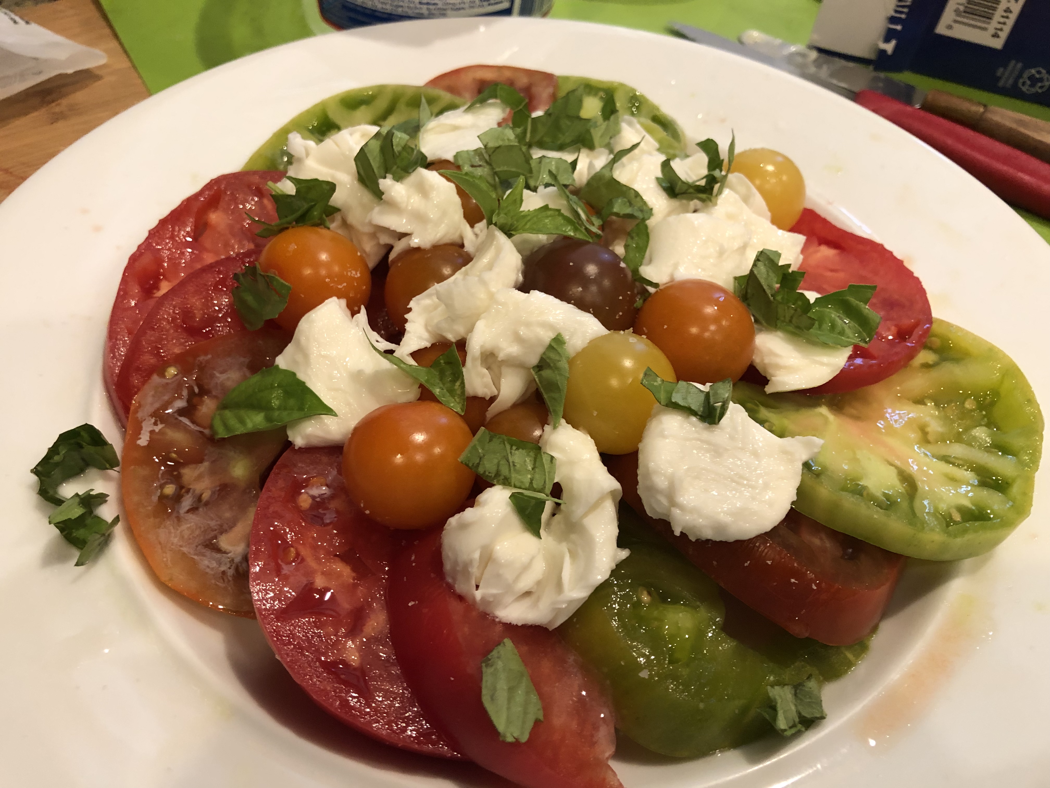 What is more perfect than corn and tomatoes for a summer dinner? Tonight was my sister’s last evening with us before taking the red eye home so we thought we would celebrate summer’s vegetables. First we took a tour of my daughter’s garden and later I made tomato sauce out of 76 Campari sized tomatoes. We had another Caprese salad using our home-grown produce plus the wonderful bi-color corn we bought at the Farmer’s Market.