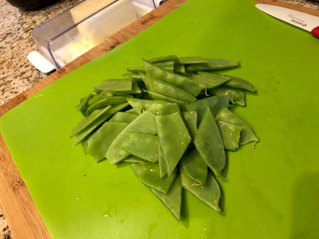 Below you can see the snow peas that I cut on a diagonal after de-stringing them. To de-string them just hold them at the end that attaches to the plant with the peas on the left side, snap the top down, and then pull downward to strip the string out. I cooked these in a little water and butter in the same amount of time as the scallops. See the red and white knife in the upper right? That is my ceramic paring knife. It is so sharp! I love it.