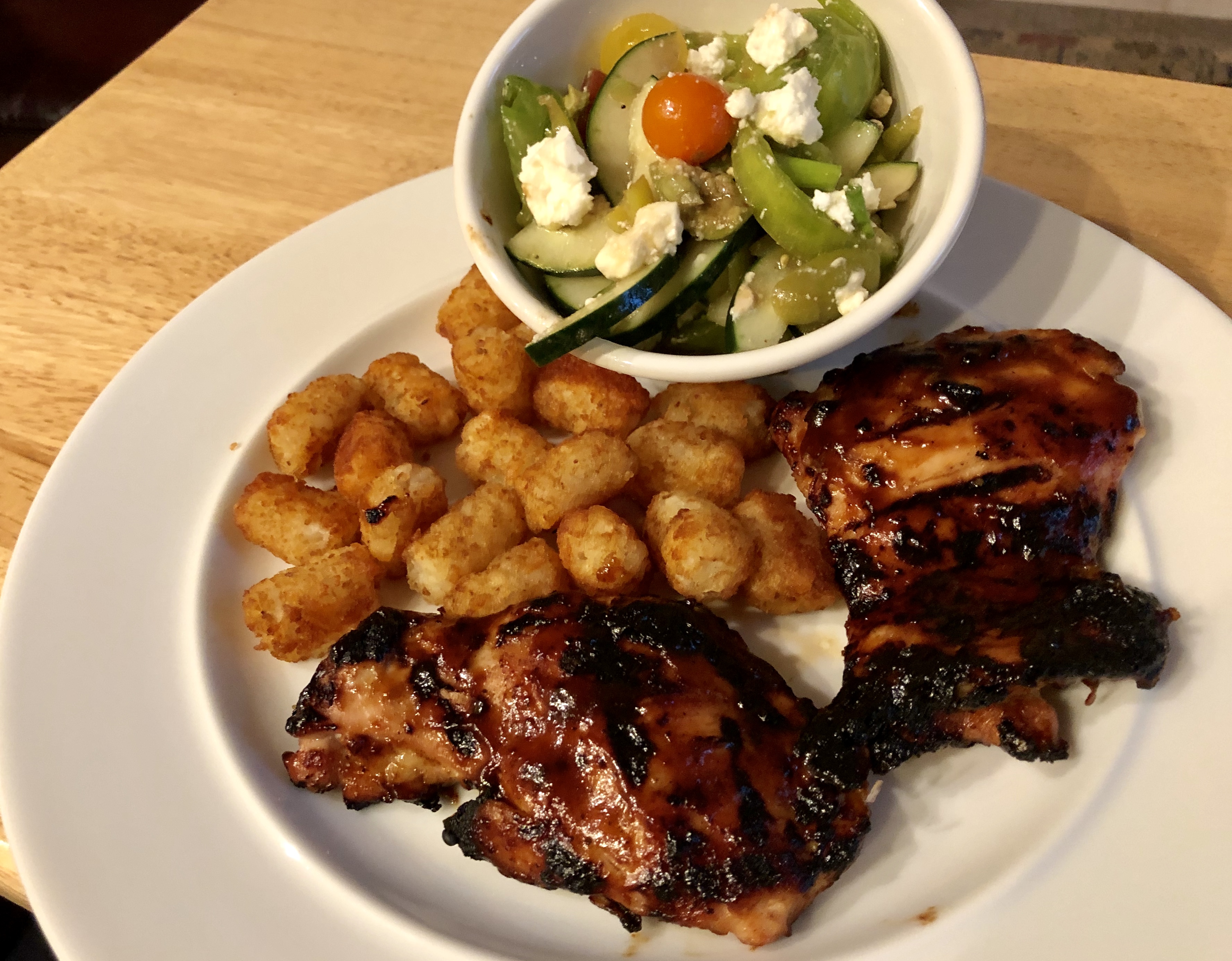 To accompany our salad John made grilled chicken thighs and I rustled up some tater tots (always a favorite.) It was a perfect summer’s night dinner.