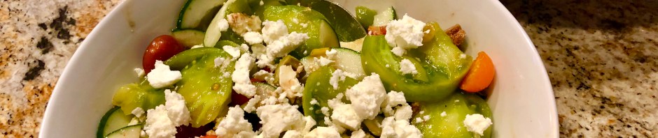 We have all sorts of tomatoes covering the kitchen table. There are large ones and petite cherries, plus all sorts of colors, green, purple, yellow, orange, and red. It is hard to keep up with this onslaught! We are giving them away and sadly putting a few in the compost bin. Tonight I made a big Mediterranean salad to use some of them.