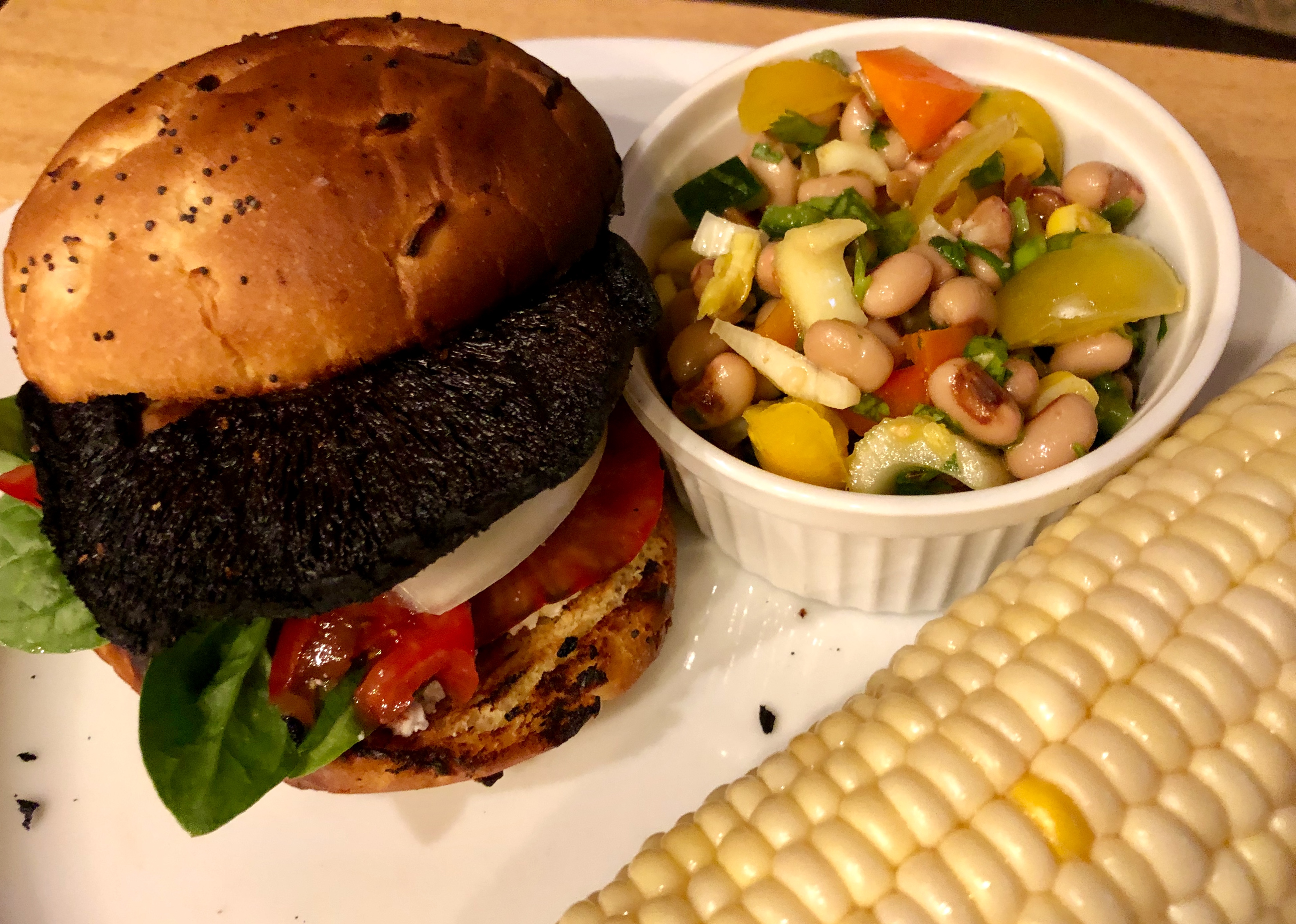 On this hot meatless Monday we are minimizing the heat in the kitchen with microwaved corn on the cob, a salad, and portobello mushrooms grilled outside.