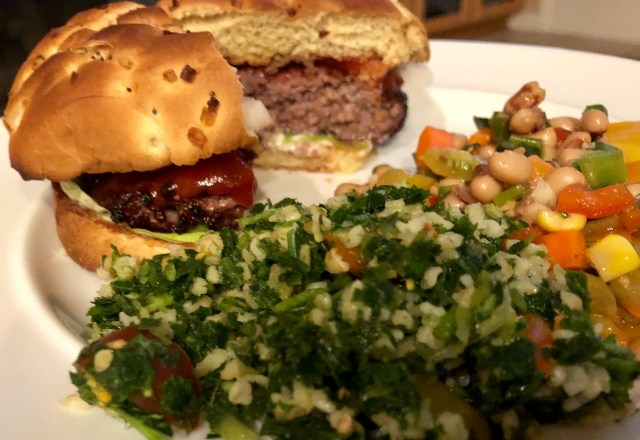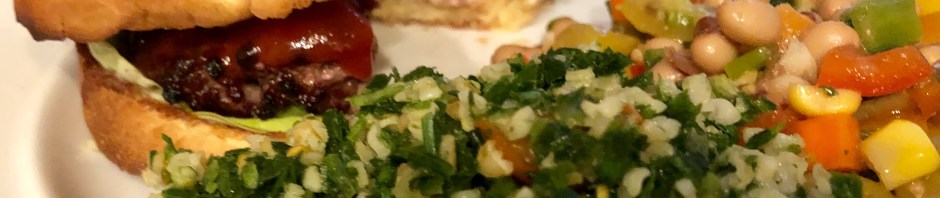 We are not going to be heating up the kitchen in these temperatures so poor John is outside cooking over a hot grill in this awful weather. According to this week’s menu I am supposed to be making Caesar salad with croutons but since we still have leftover Texas caviar and tabbouleh I am taking the easy route and serving them. I have added a little serrano chile to the Texas caviar since John thinks it is to mild.