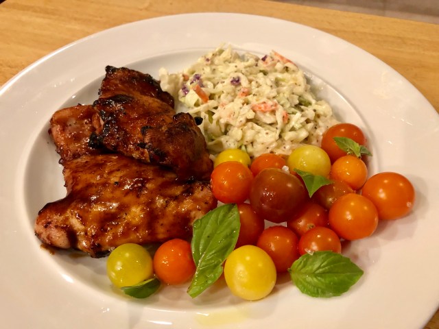 Just plain old boneless, skinless chicken thighs on the grill tonight cooked by John. I made cole slaw and cherry tomatoes with oil, basil, and Trapani sea salt.