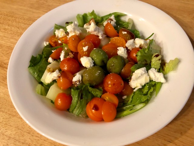 My Mediterranean salad consists of Romaine lettuce, cucumber chunks, our abundant orange cherry tomatoes, olives, feta, and oil and vinegar. In Italy you are never given a recitation of salad dressings to choose from. Plopped down on the table is a set of oil and vinegar and salt and pepper. Dress your own salad!
