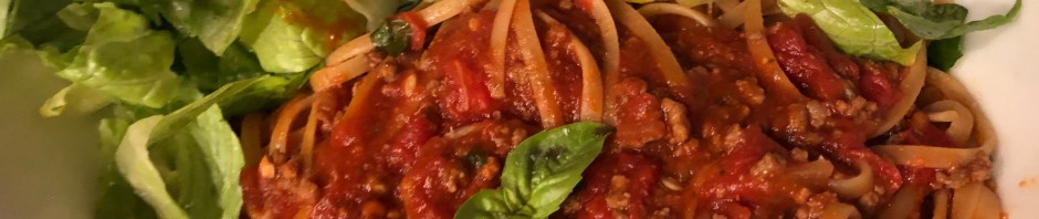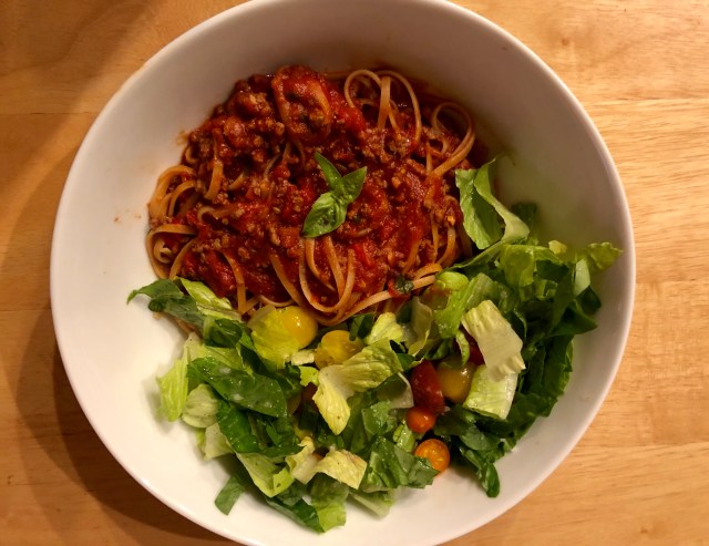 In deference to my diet I made less pasta and filled half my bowl with salad. I made the spaghetti sauce in July and I do not know the exact amounts of the ingredients so I could not assign a WW value to my dinner. I figured that eating less would have to make it okay.