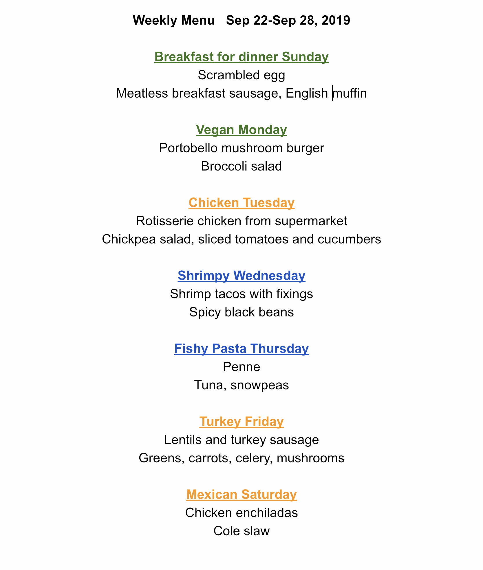 This week we stuck to the menu until Wednesday when I discovered I had way too many leftovers in the refrigerator. So I inserted a leftover day and started moving what was the remainder of the week around. We never got around to the scallops or gazpacho. I know scallops will make the menu soon but I think I am cold-souped out for this season. If only the weather would cooperate! I am ready for hot soups and stews. Hopefully this coming week will be the last of hot temperatures.