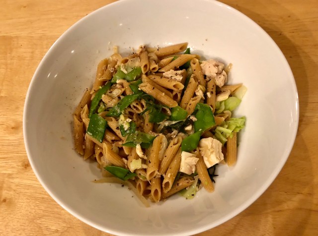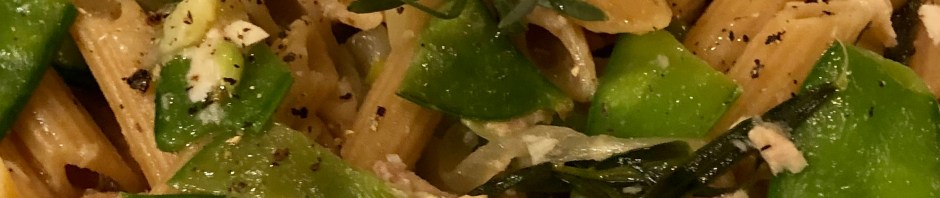 Thursday’s dinner was another “pantry” dinner. Some pasta, a can of tuna, olive oil, an herb, and a vegetable. Although I used fresh snow peas and tarragon, it could just as easily have been made with frozen peas and dried parsley or oregano.