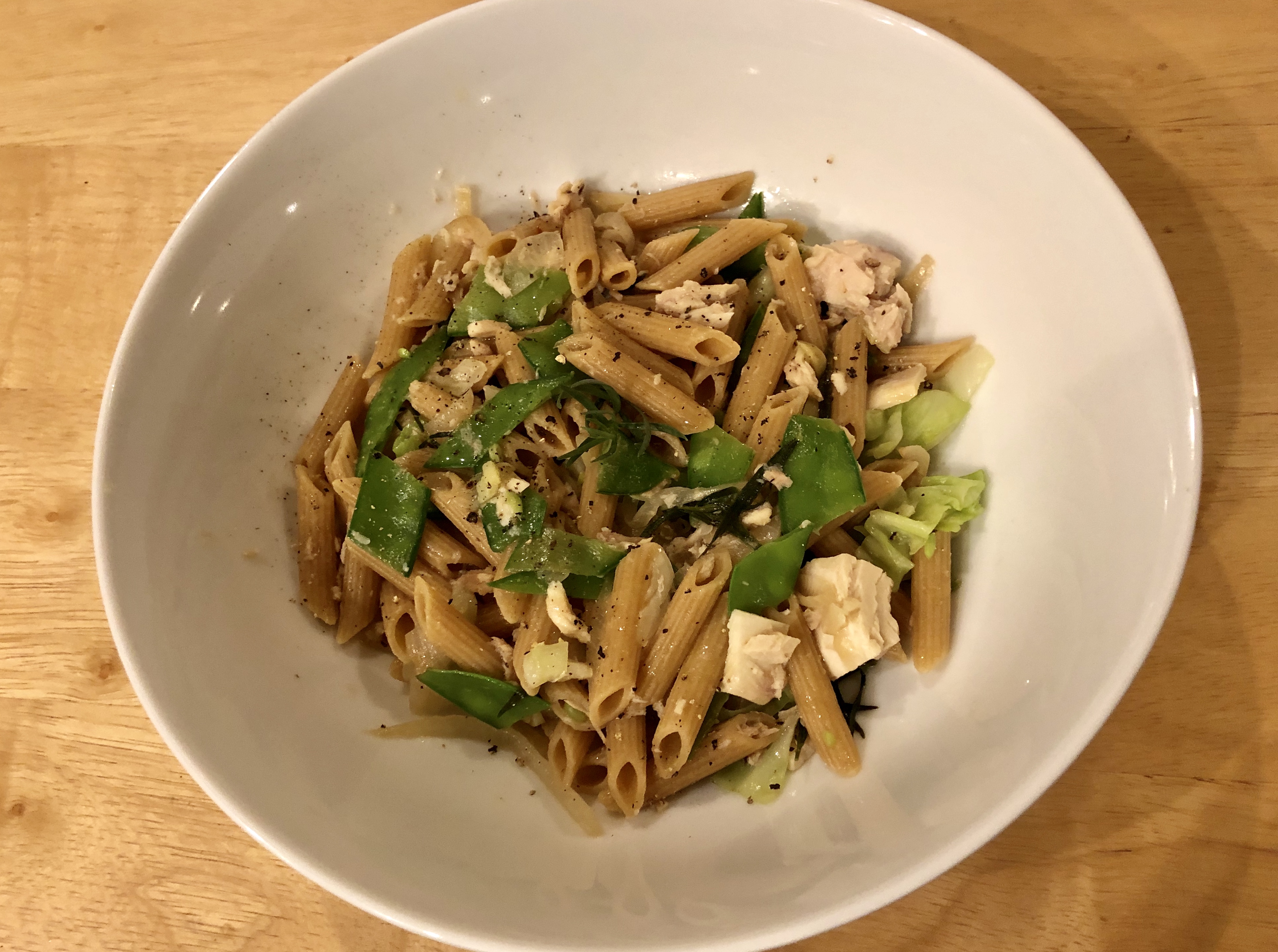 John boiled the whole wheat penne in salted water while I sautéed some onions and garlic. When the pasta was nearly done I added the snow peas and tarragon. After he added the pasta to the pot and I had made a kind of sauce out of pasta water and olive oil, I put in the tuna trying not to break it apart too much. For finishing I added a little drizzle of our best olive oil and some cracked black pepper.