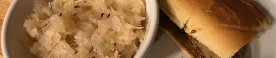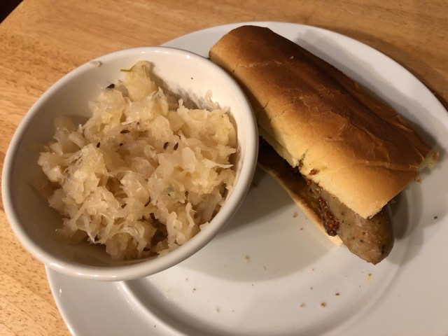 I just made something easy for dinner tonight. The bratwursts come from Trader Joe’s and are cooked in a little water and oil until the water evaporates and the sausage browns. The roll is a Cobblestone sausage roll. I cut off the ends and pulled some of the bread out of the center to make it 3 WW points. The sauerkraut is from a can doctored up with caraway seeds and Splenda. I really like Maille’s whole grain mustard with the bratwurst.