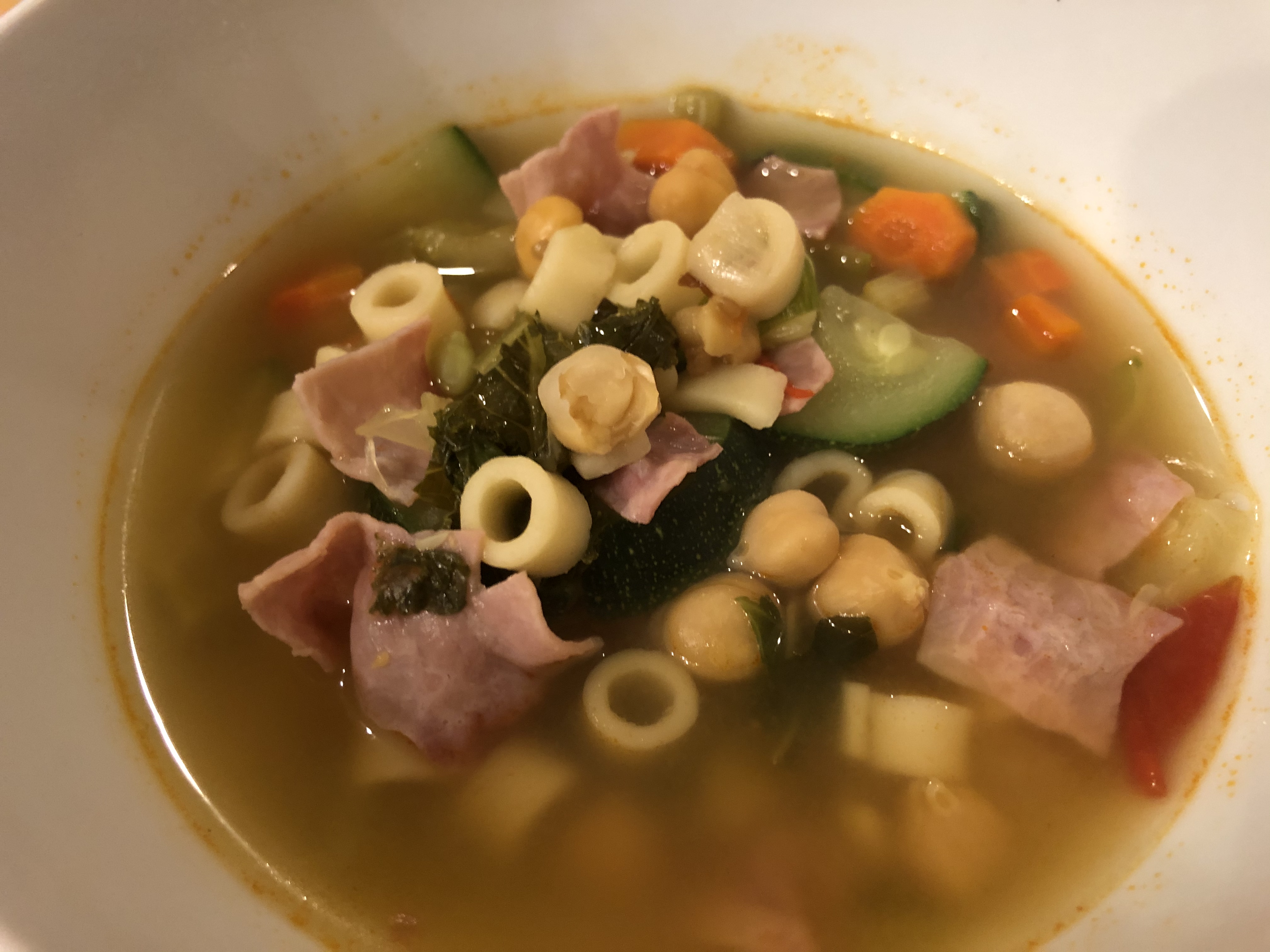 Add those two soups together. Add a little vegetable or chicken stock, the three pieces of deli ham moldering in the cold cut drawer, and a teaspoon of harissa and it’s another whole dinner! The combination was more than the sum of its parts.