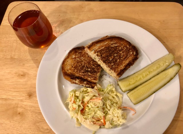 We have been having a lot of easy dinners lately. Probably I just need a breather from all the cooking. However, even though this was just a sandwich and a side I did make both the tuna salad and the cole slaw. I put the tuna salad on rye bread and covered it with an ultra then slice of cheddar cheese. John grilled it in our cast iron frying pan pressing it down so it came out panini-style. The cole slaw was made from cabbage, carrorts, and onions. The dressing consisted mainly of some light mayo, some non-fat plain yogurt, mustard, lemon juice, and celery seed.