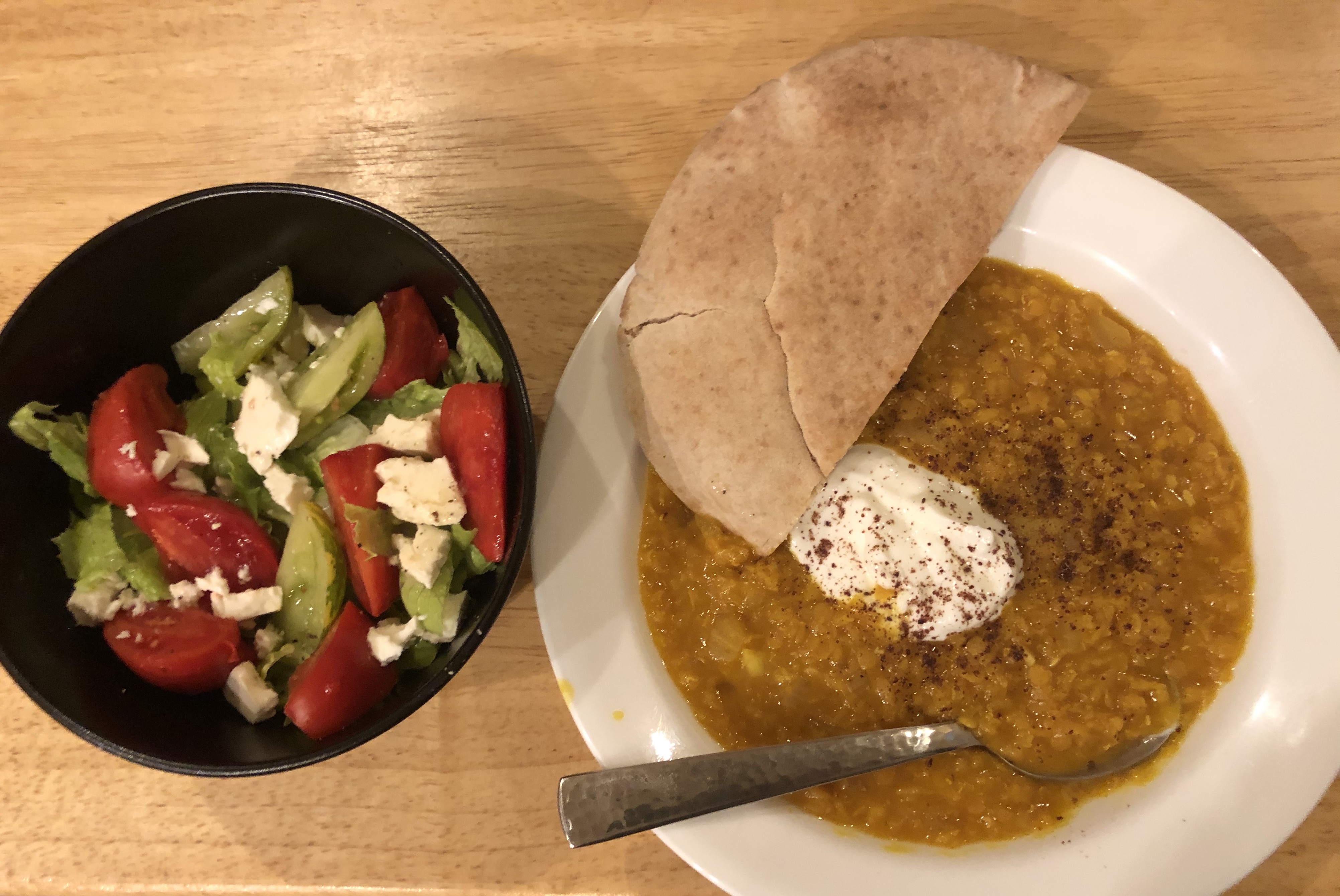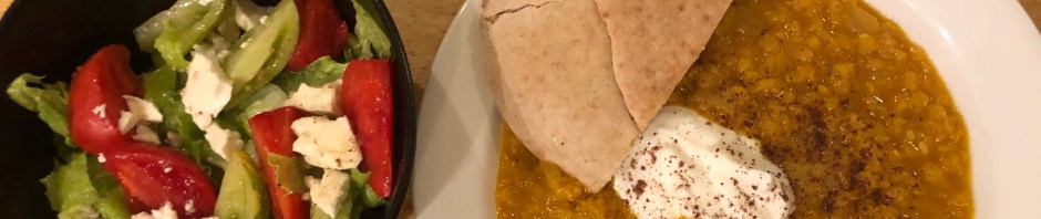 So easy, so quick, so healthy, so delicious! Fresh ginger, onions, and garlic. Turmeric, cumin, cayenne. Sauté in a little oil. Add stock and red lentils. Cook 15 minutes. Top with yogurt and sumac. Yum!