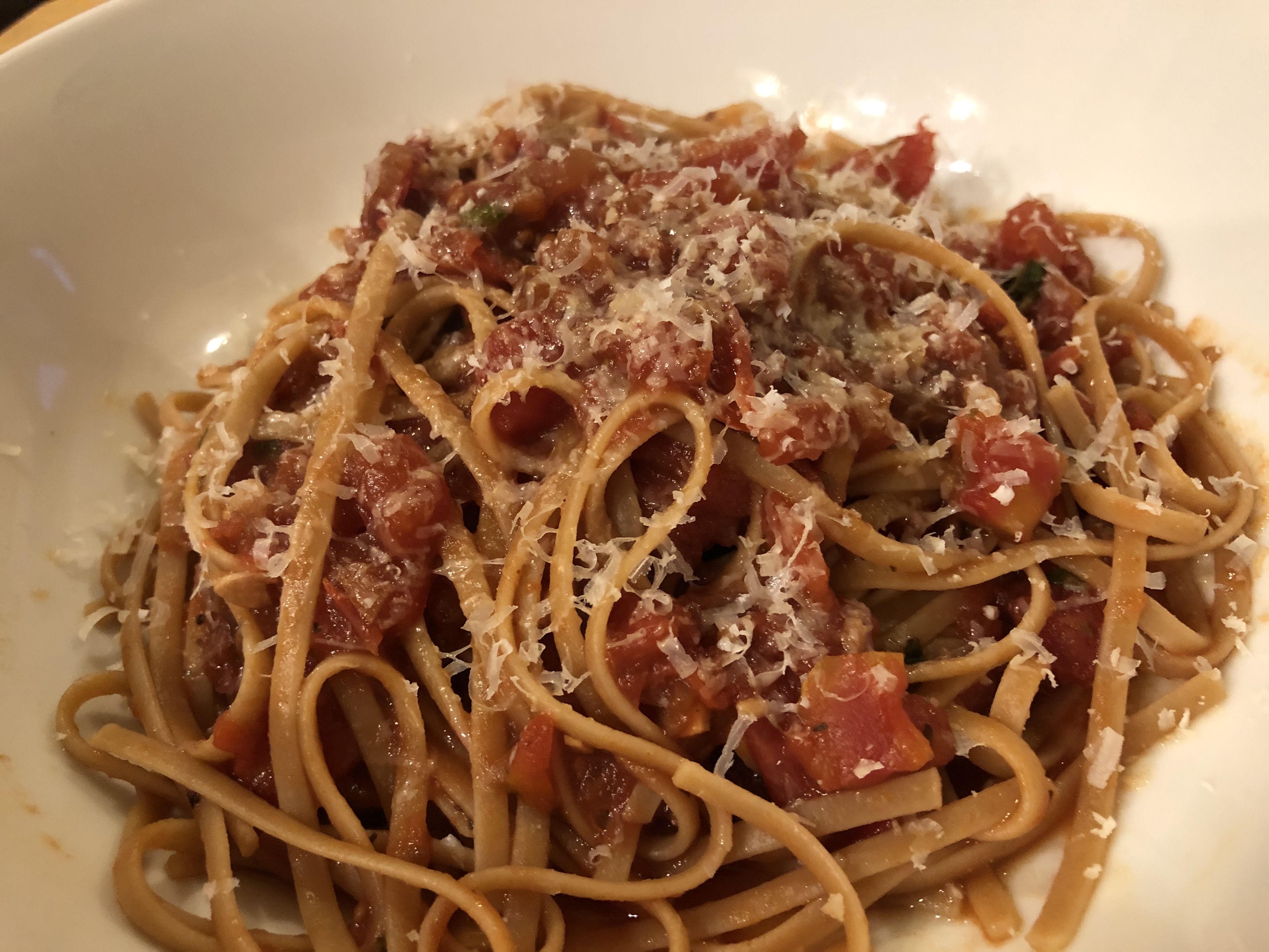 So I made a quick tomato sauce with some canned and some fresh tomatoes. John, at my suggestion, cooks 8 ounces of whole grain linguine. We indulge. This morning I am up a hard fought for pound. I have shown remarkable control these past 7 weeks but put me near pasta and I lose all my will-power. Oh well, it is back on the righteous train on Tuesday. Sigh.