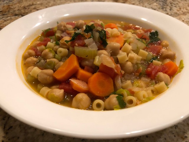 It is our first day home and we are jet lagged and do not have the energy to go to the grocery store so we decide to make our dinner from kitchen and pantry staples, Spicy Chickpeas with Pasta.