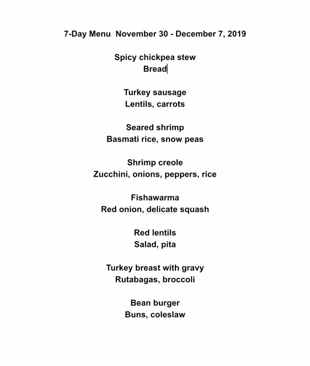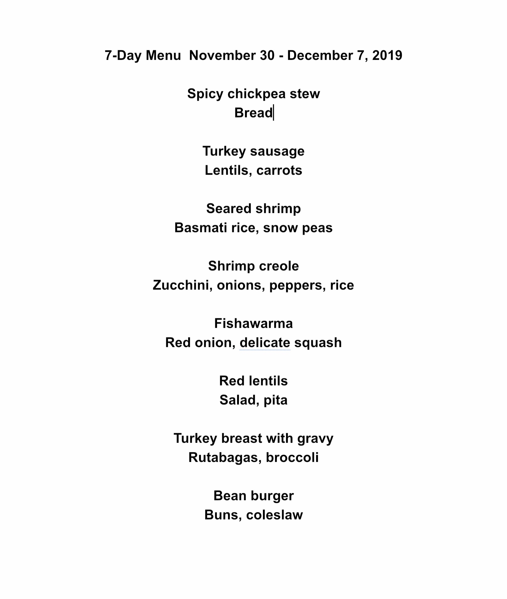 Here is the menu for this week. Hey, I just realized my week has eight days and eight meals! I guess that is what jet lag does to you! I also see I left the cursor in the picture after “bread.” And did not catch the auto correct from “delicata” to “delicate.” I think I need a nap!