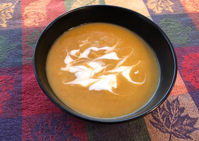 The recipe calls for a chopped up onion and then one cup each of diced butternut squash, rutabaga, carrots, Granny Smith apple, and sweet potato. I did not have a sweet potato but I did have my leftover mashed rutabaga, a delicata squash, the onion, carrots, and a Honeycrisp apple. You are supposed to start with a stick of butter so I splurged and put in a tablespoon. I used a quart of vegetable stock as the cooking liquid. When everything was soft I used a stick blender to whiz it up, added some more salt, an ounce of heavy cream, and a pinch of cayenne pepper. I had a bowl. John had two bowls and there is still a bunch left over. It made a Friday lunch taste like a holiday!
