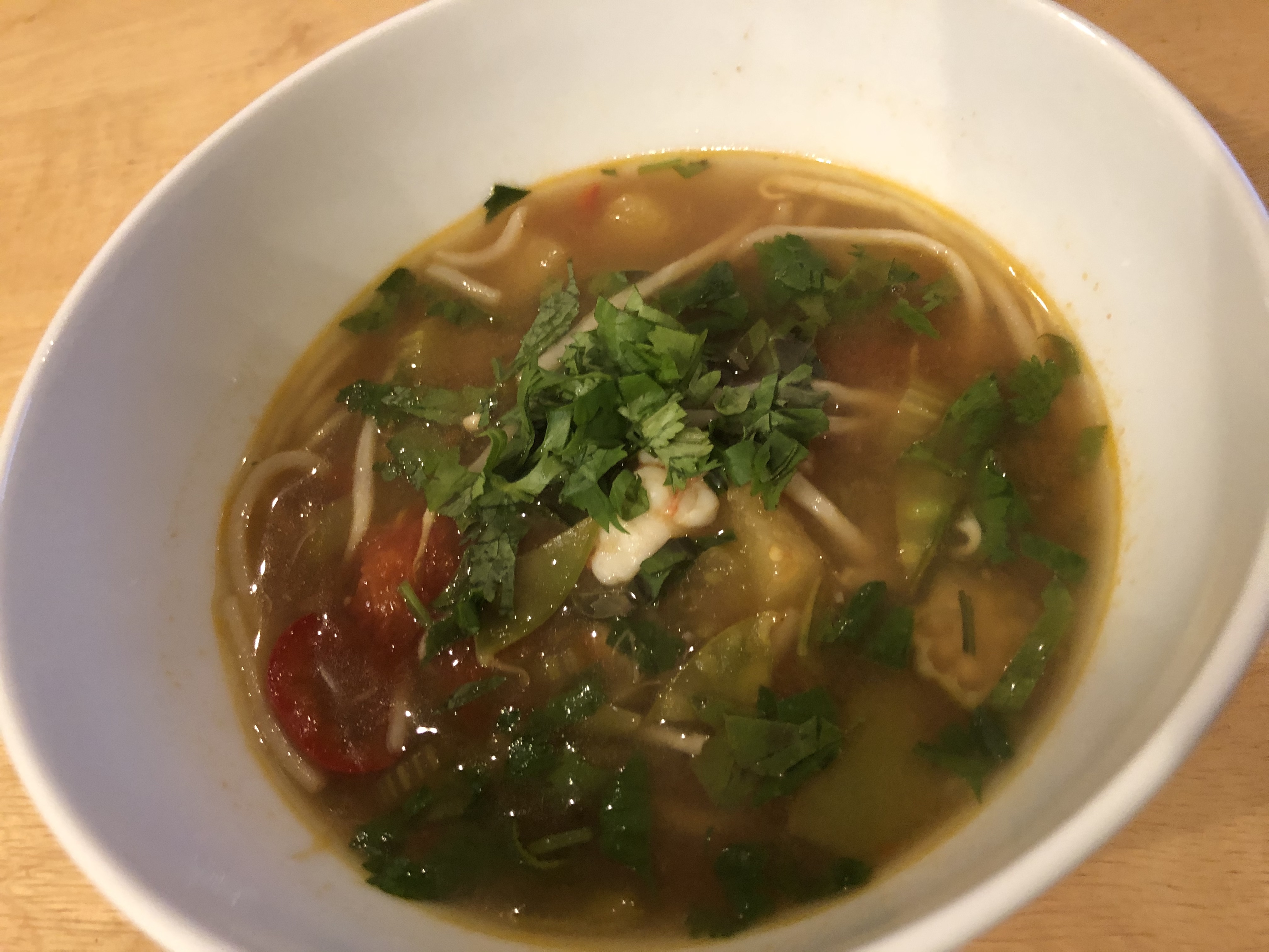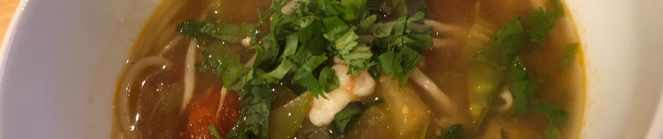 We re-made our authentic Vietnamese sour soup a little less authentic on the second try. This time we made it more to our liking adding a vegetable broth and more vegetables, a little less tamarind, and a more balanced fish sauce, sugar, salt combo. We also cut the shrimp and pineapple in smaller pieces so that they were more the size of the okra pieces. We found the two rice paddy herbs but after tasting them we only used one and threw the other one away. In the future I will stick to cilantro.