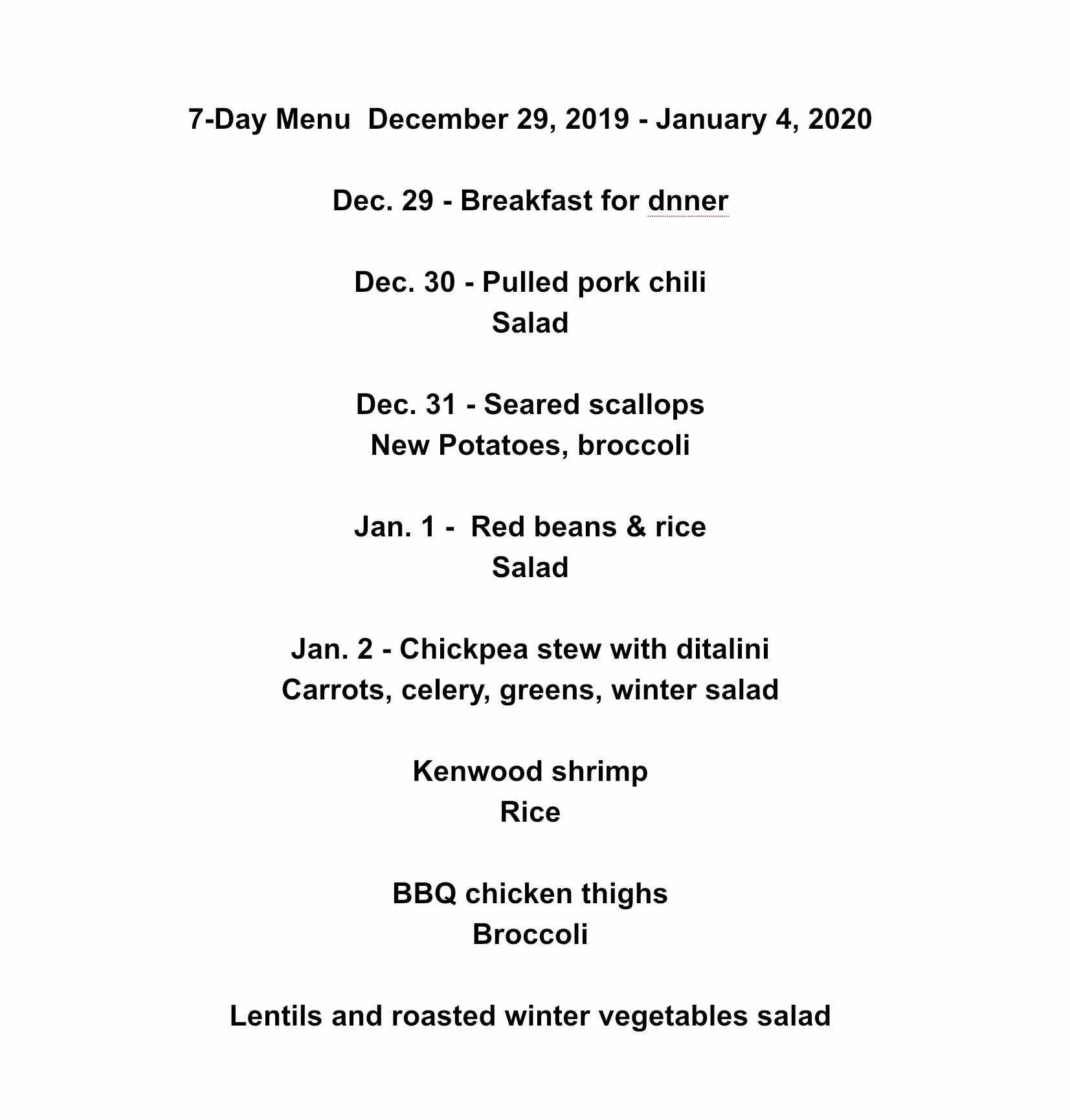 As usual I have planned 8 dinners for 7 days to give me plenty of flexibility. This week however I know what we will be eating for the first part of the week since it will be a fancy dinner for New Year’s Eve, a traditional dinner for New Year’s Day, and then we are having friends stay over on January 2. After that we will just see what item on the menu strikes our fancy.