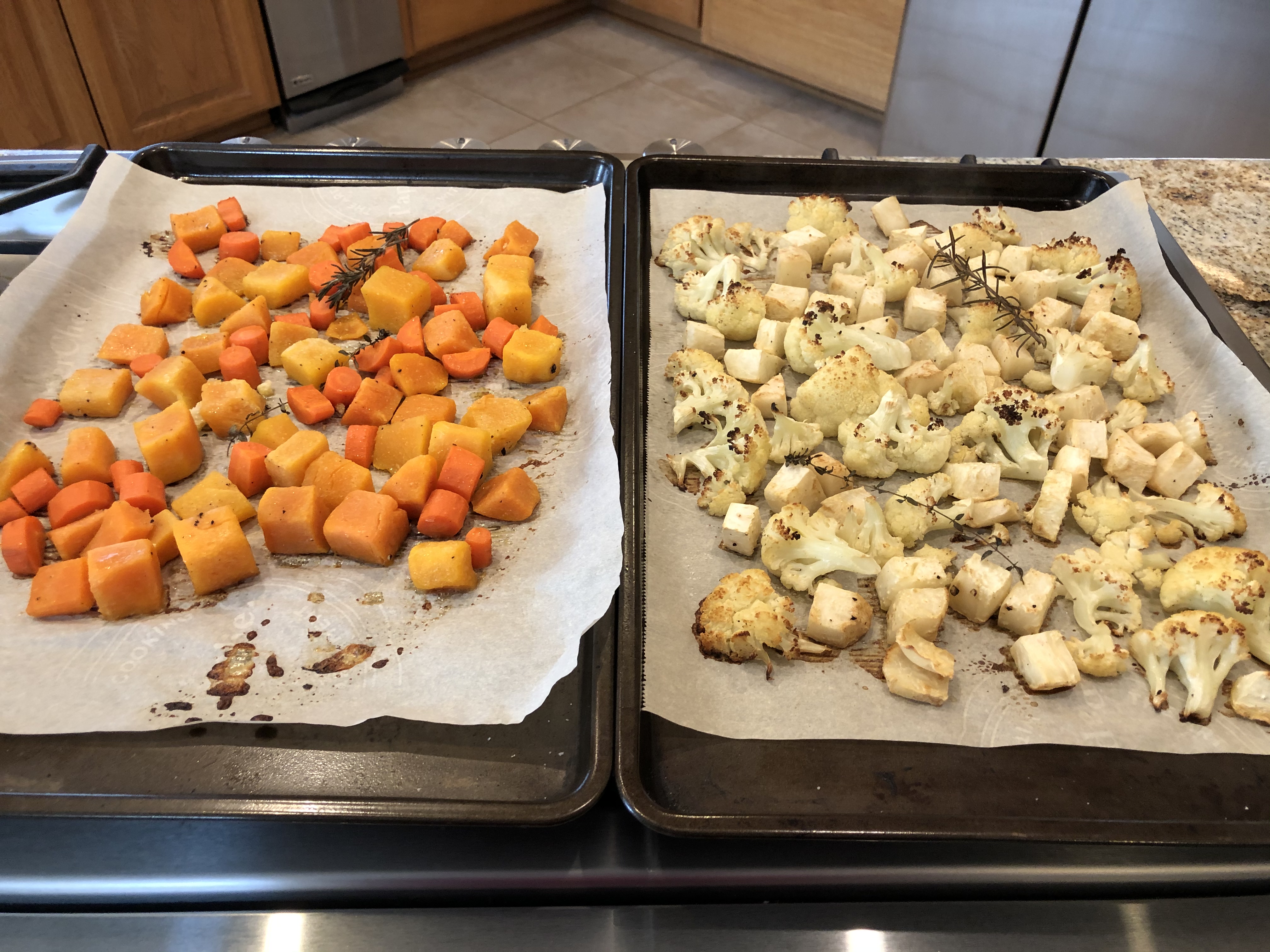 This is my take on a recipe by Melissa Clark of NY Times Cooking. I wanted more vegetables and to make it a little less fussy. It turned out really tasty even with my shortcuts like pre-chopped butternut squash, bottled vinaigrette, and hearty greens from a container instead of radicchio. My recipe is included below.