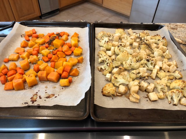 After they were cut up I put them in a plastic bag with a tablespoon of olive oil and some salt and pepper and massaged them around . Then I cooked them in a single layer on a lined sheet pan in a 400F degree oven for a total of 40- 50 minutes. For the first twenty-fivc minutes of cooking they are covered and for the last 20 minutes, uncovered. Poke them to see if they are done.