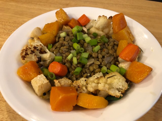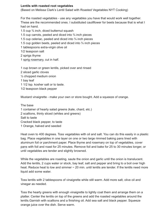 While they are cooking you can make the lentils according to the recipe. This recipe is originally called a salad but I prefer everything served warm. So it is time for assembly. Hearty greens on the bottom, lentils next, and vegetables all around.
