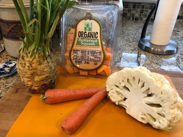 First I assembled the vegetables to be roasted. A celeriac or celery root is a strange looking thing but it has a nice nutty flavor when roasted. And although the recipe calls for beets, and I would have been using golden beets if I had had them, I substituted in half a head of cauliflower.