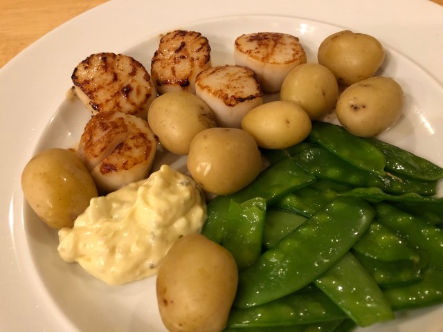There is no real recipe for this. John sears the scallops. I steam the potatoes, and sauté the snow peas. I make some tartar sauce. And then we dig into the best low calorie meal ever created. Yum!