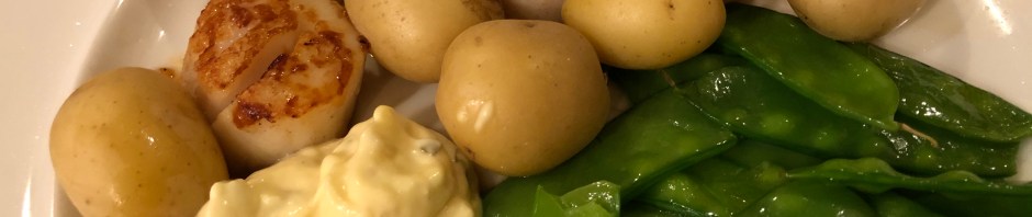 There is no real recipe for this. John sears the scallops. I steam the potatoes, and sauté the snow peas. I make some tartar sauce. And then we dig into the best low calorie meal ever created. Yum!