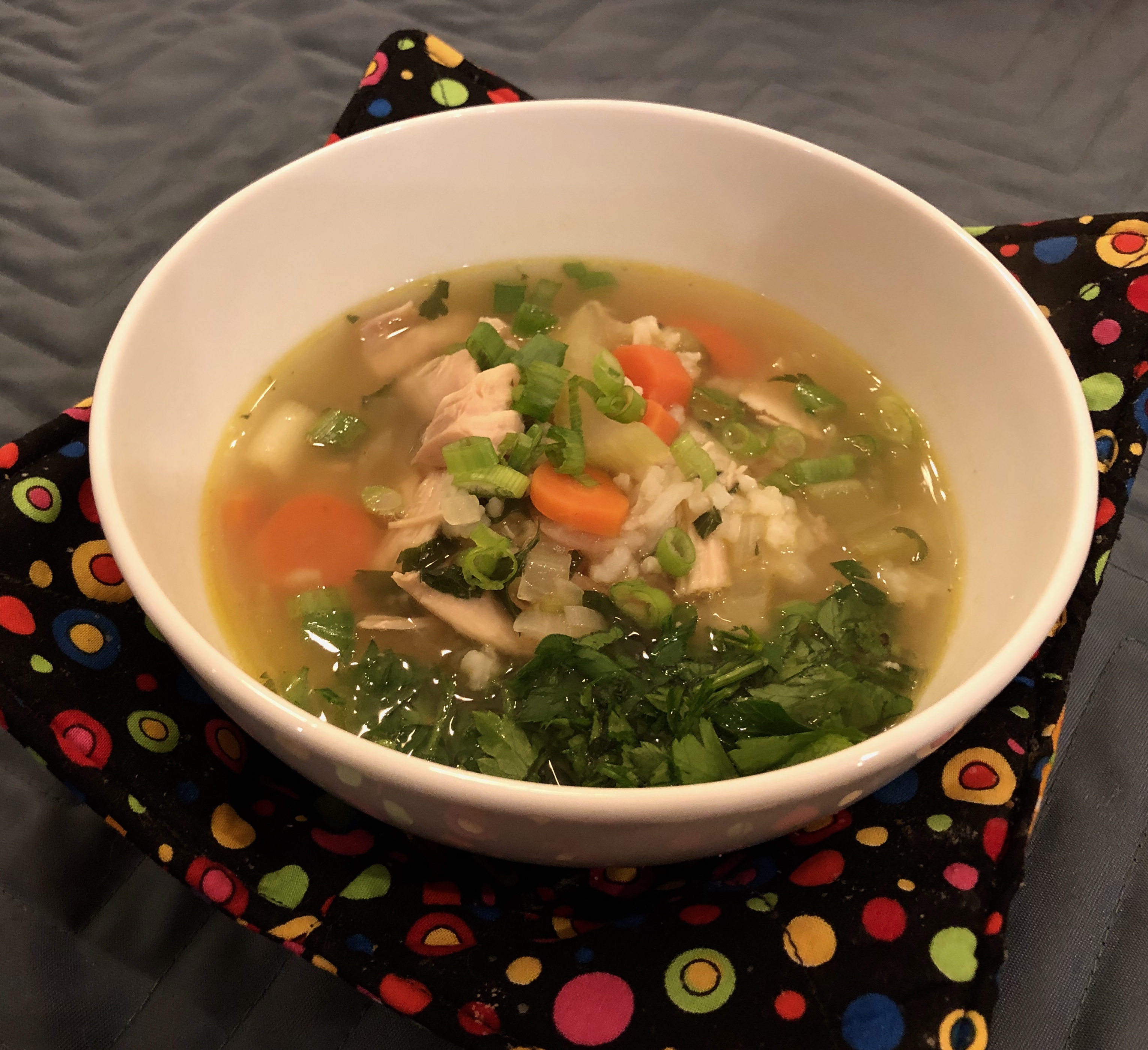 We are trying to use up old leftovers so we can create new leftovers! We still have some chicken from our Costco chicken and some rice from who knows when. Pair those with onions, carrots, celery, parsley, and some chicken stock and dinner is done.