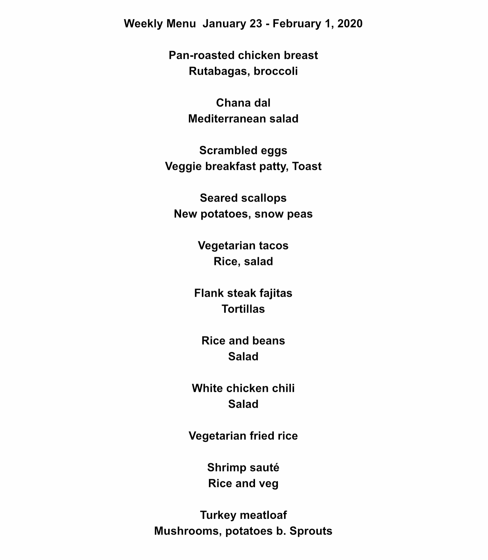 On to the menu! I have ten entries.Β I started from the day I got back from San Antonio (Jan. 23) through next Saturday (Feb.1). We will eat them in some random order depending on what we feel like eating. There are 5 vegetarian meals, 2 each of chicken and seafood, and 1 meat. Hopefully you will get some ideas for dinners you can make at home.