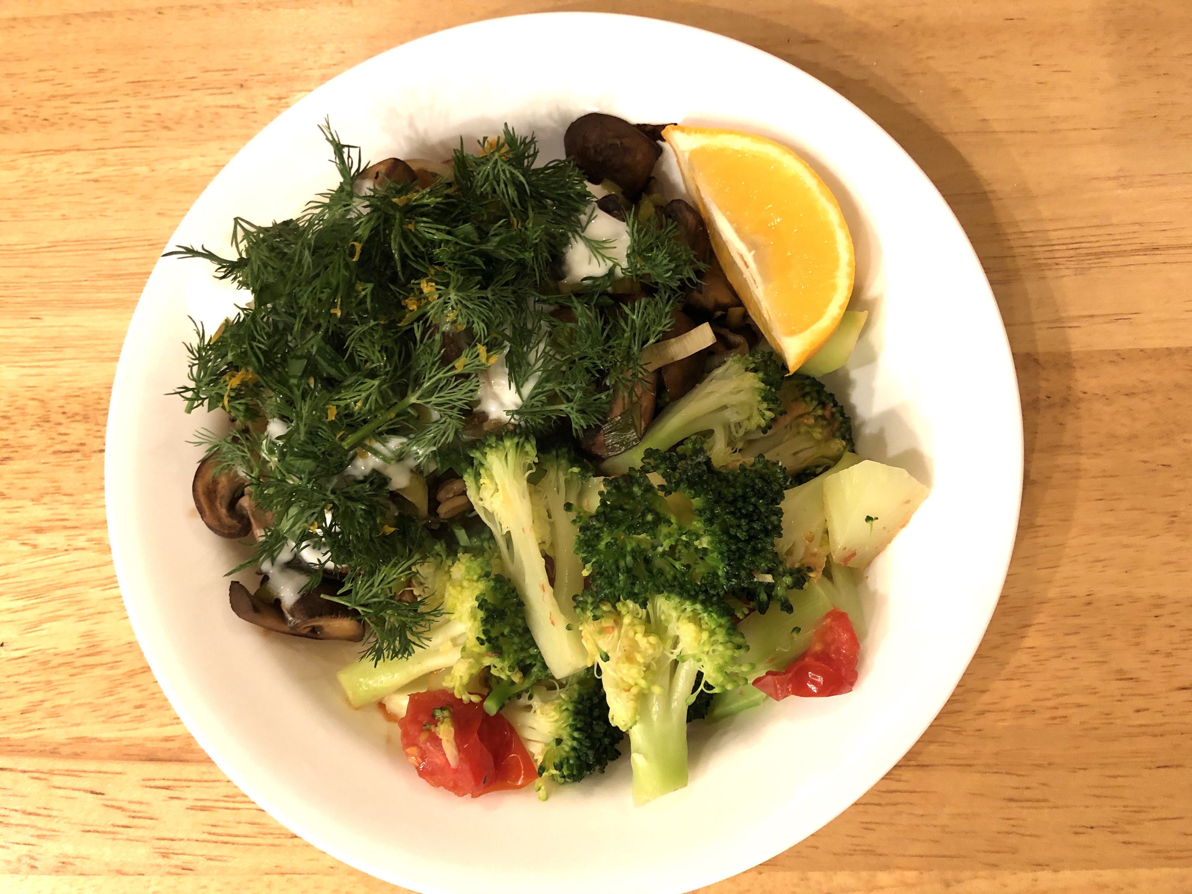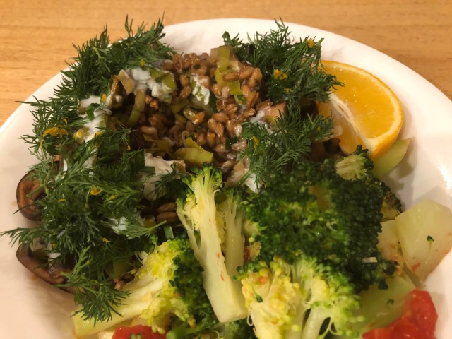Tonight we try a new recipe, farro with mushroom and leeks (other major players include yogurt, chives, and dill). After sautéing the mushrooms and leeks, John pops them in a low oven to keep them warm while cooking the farro. The farro cooks risotto-style adding a little warm stock at a time. Once the farro is cooked, the two components are put together along with the various garnishes.