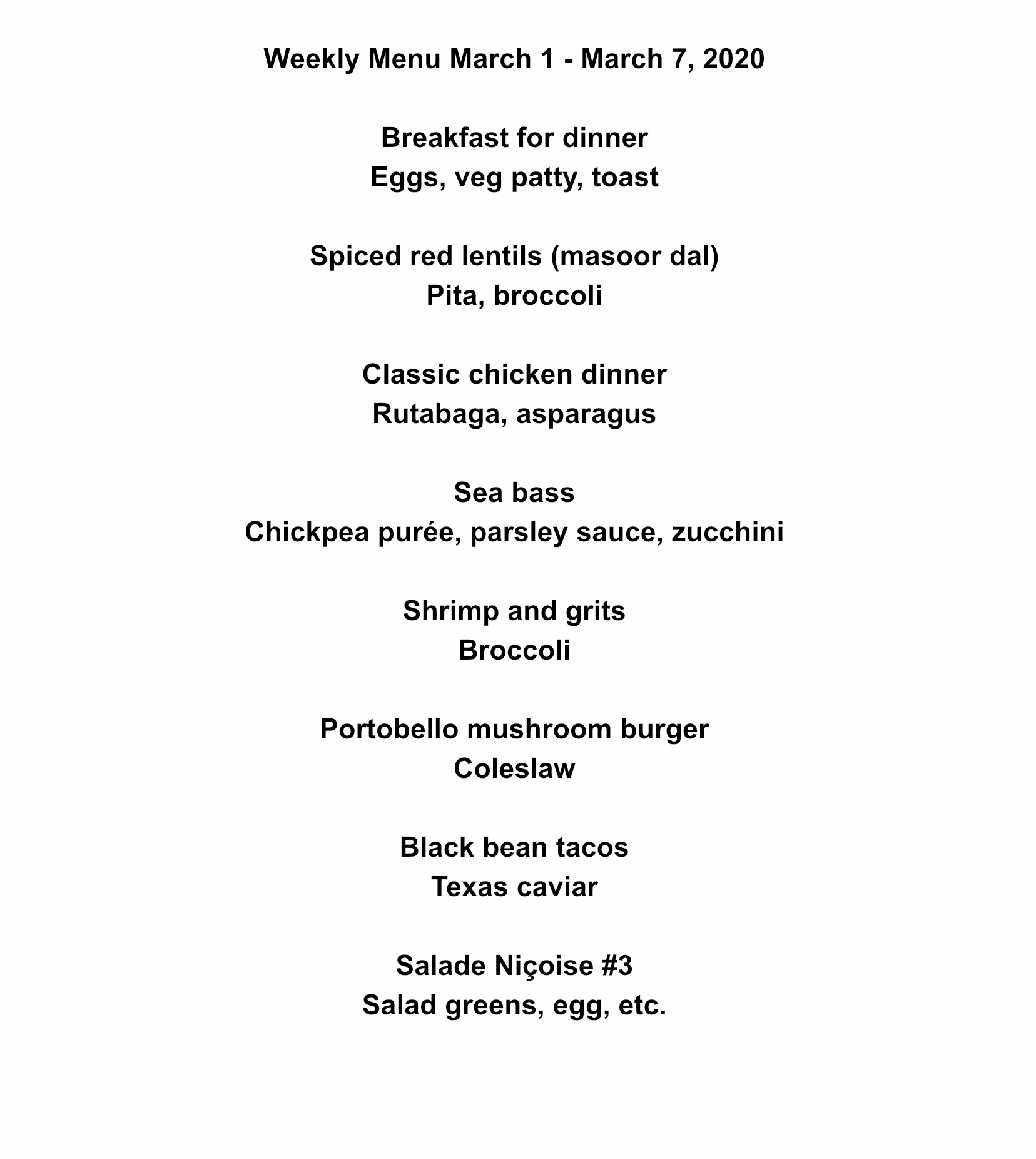 Here are eight ideas for your personal dinner menu this week. They are in no particular order and there are eight ideas for seven days so we can be flexible. There are 4 vegetarian meals a couple of which are vegan, 3 fish or seafood, and 1 chicken meal. My menu is especially good for dieters! We always start with breakfast for dinner on Sunday night. This week John made himself a fancy omelet while I stuck with over easy eggs on toast with a veggie breakfast patty and blueberries with plain yogurt for dessert. Enjoy!
