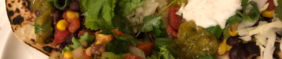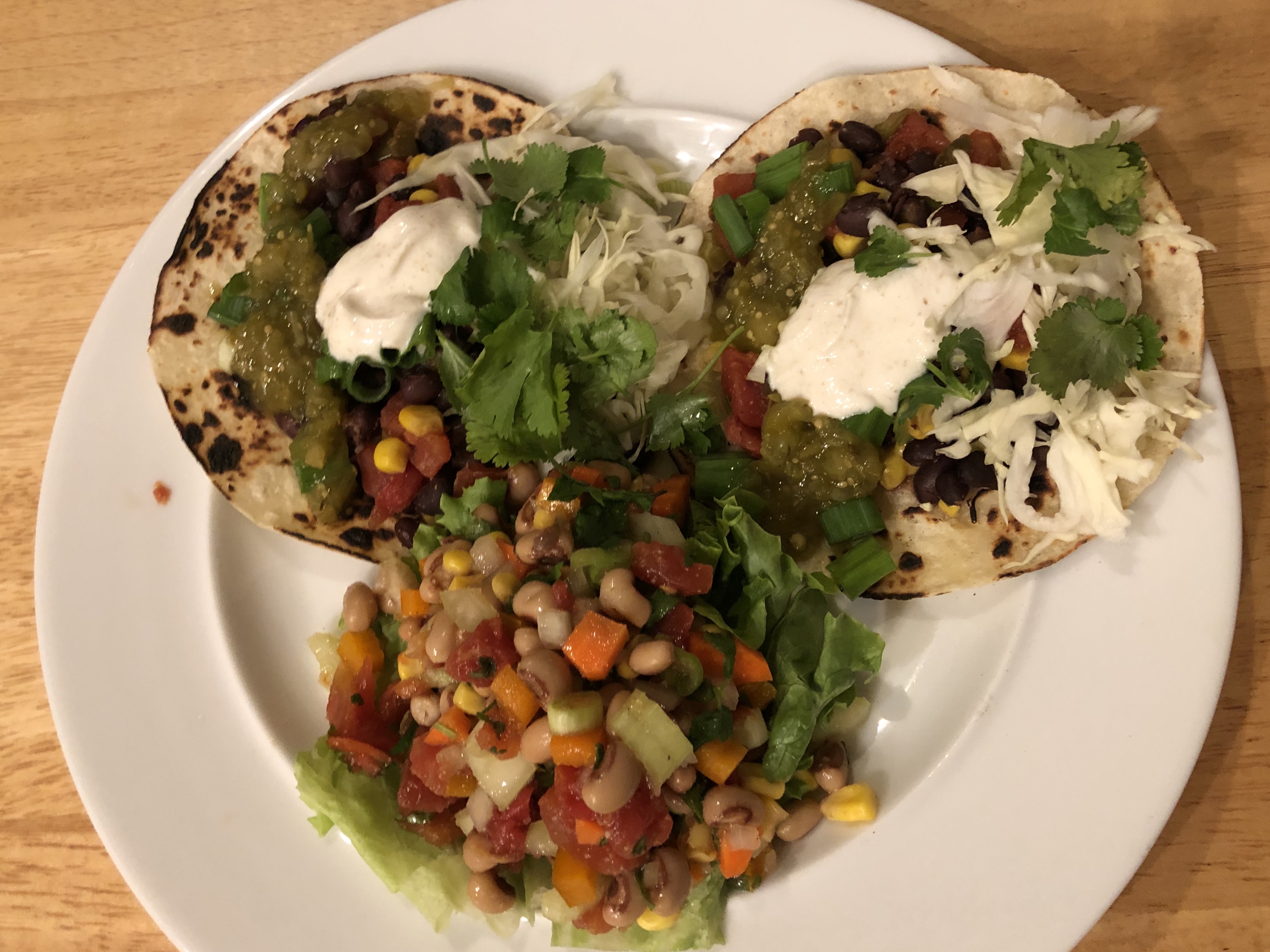 Black bean tacos and Texas caviar have a lot of components that need chopping but there is very little cooking. I take a short-cut with the Texas caviar and use half of a can of drained Rotel and dump the other half in the black beans. Chopping up tomatoes is not one of my favorite things to do. In addition to the Rotel the Texas caviar has black eyed peas, corn, carrots, celery, bell pepper, white onion, and green onion all in uniform size. I use plenty of cumin and some garlic powder, a dash of vinegar, some of my super salad dressing, salt, and a bunch of sriracha to season the vegetables.